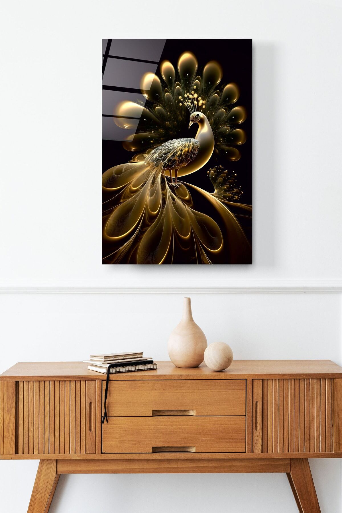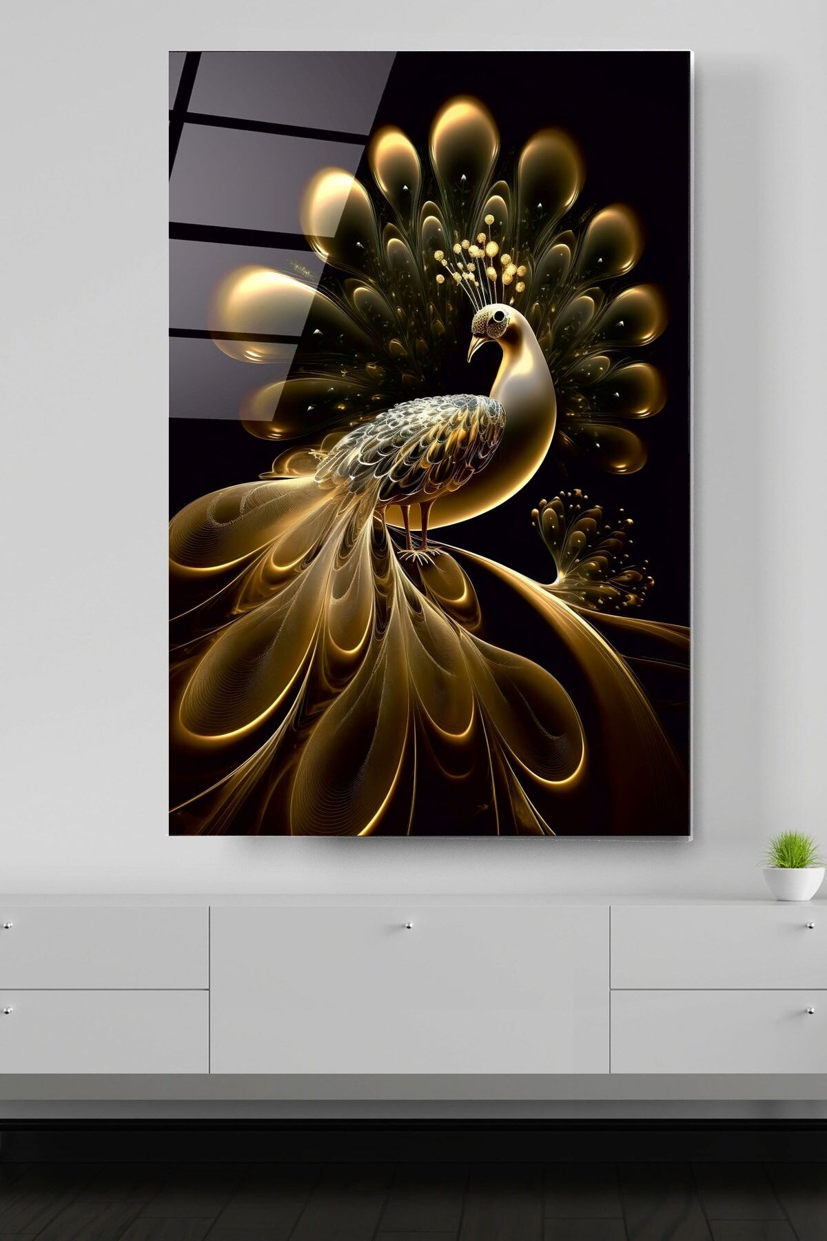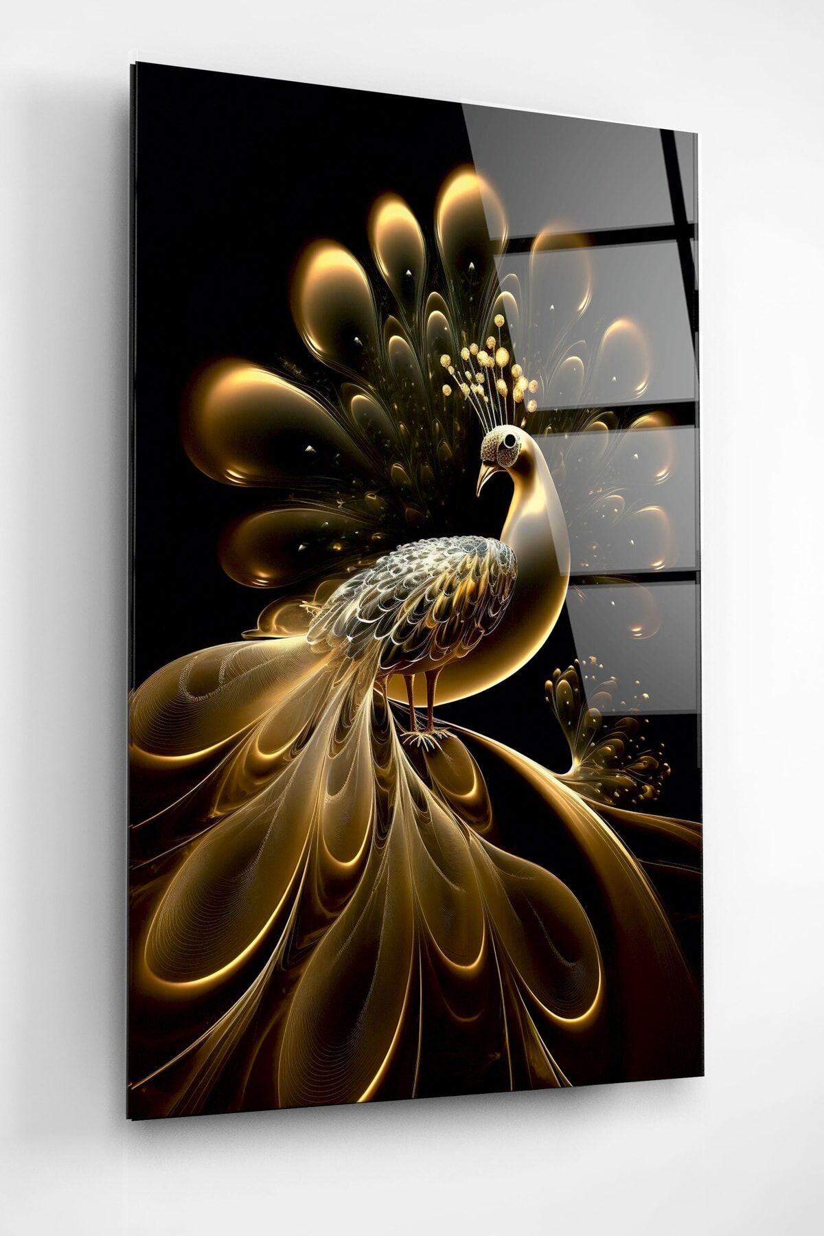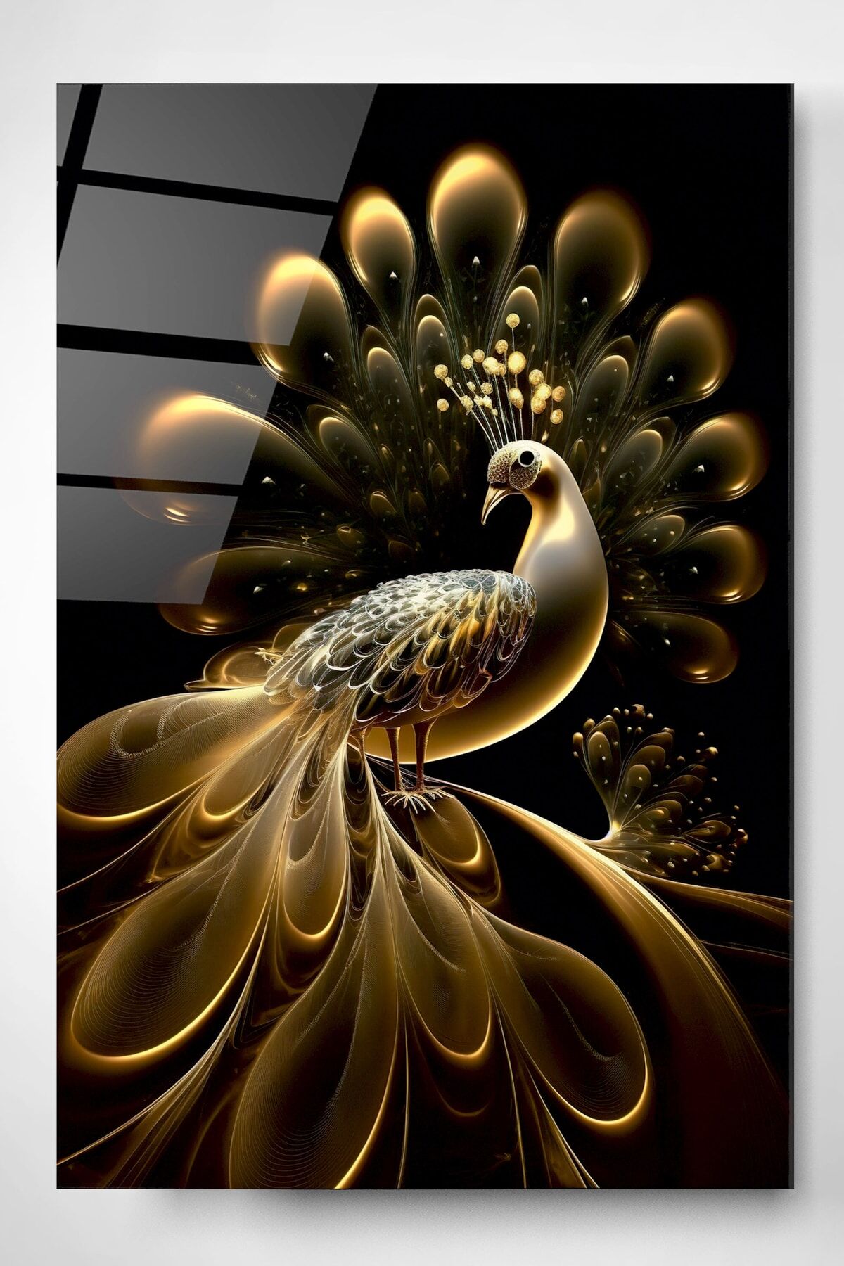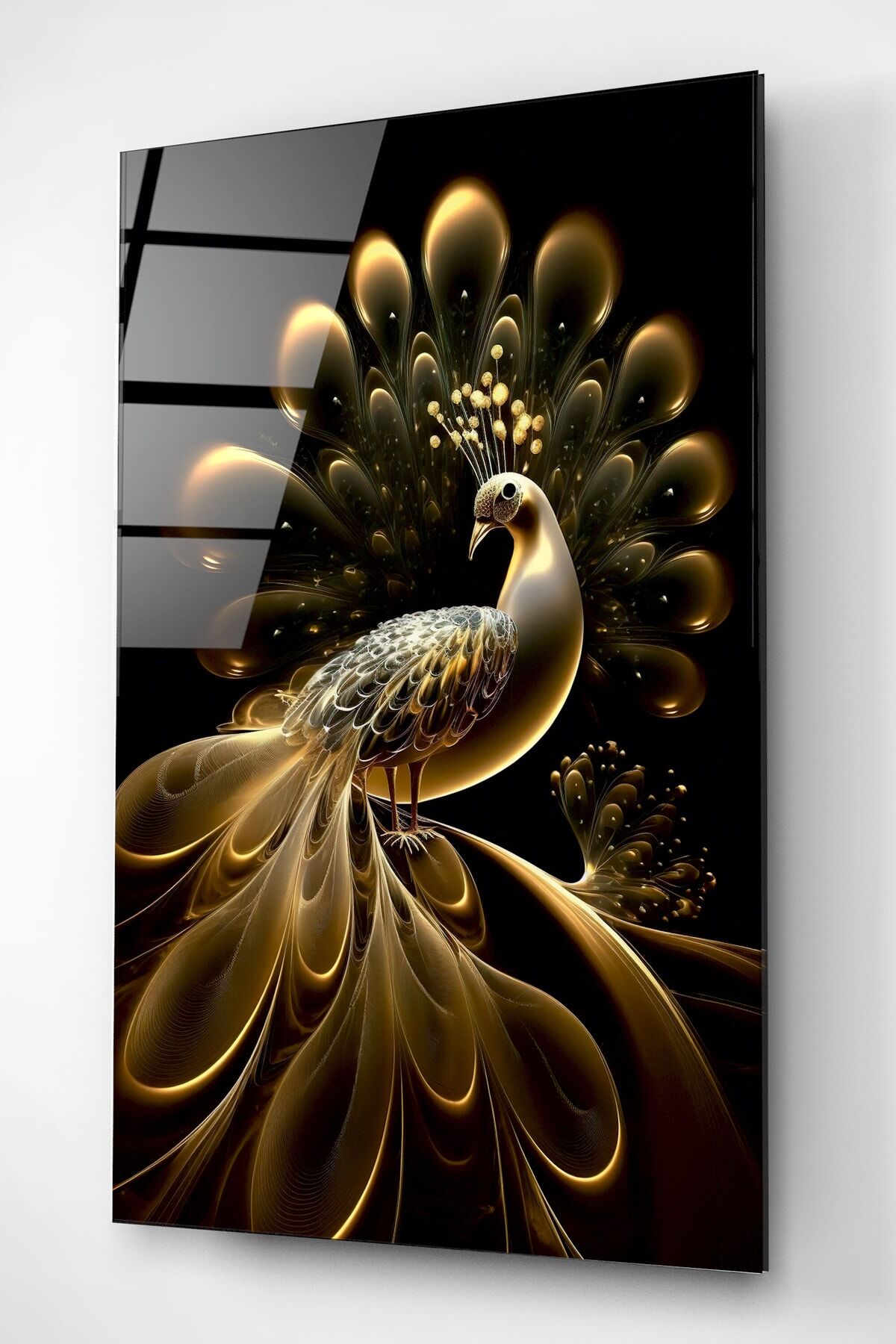 Gold Tavus Kuşu Cam Tablo, Dekoratif Cam Tablo
