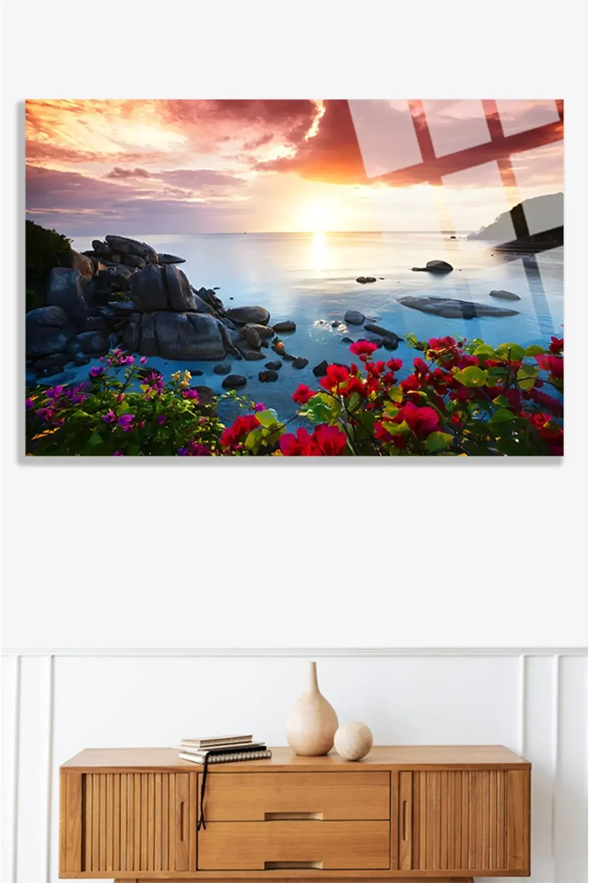 Gül ve Deniz Manzarası Kırılmaz Cam Tablo, Ev Ve Ofis Hediyesi Yüksek Çözünürlüklü 4mm Lüks Tablo