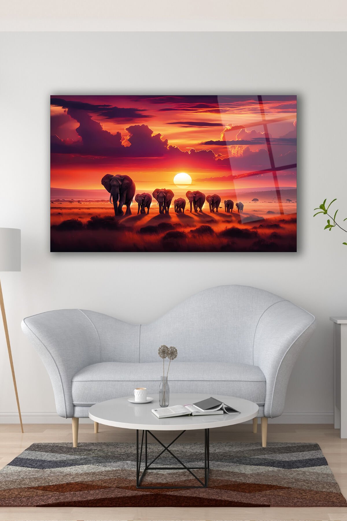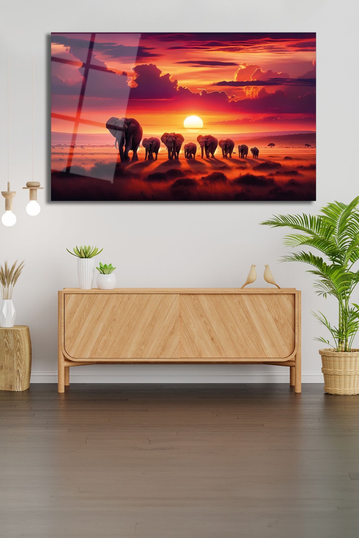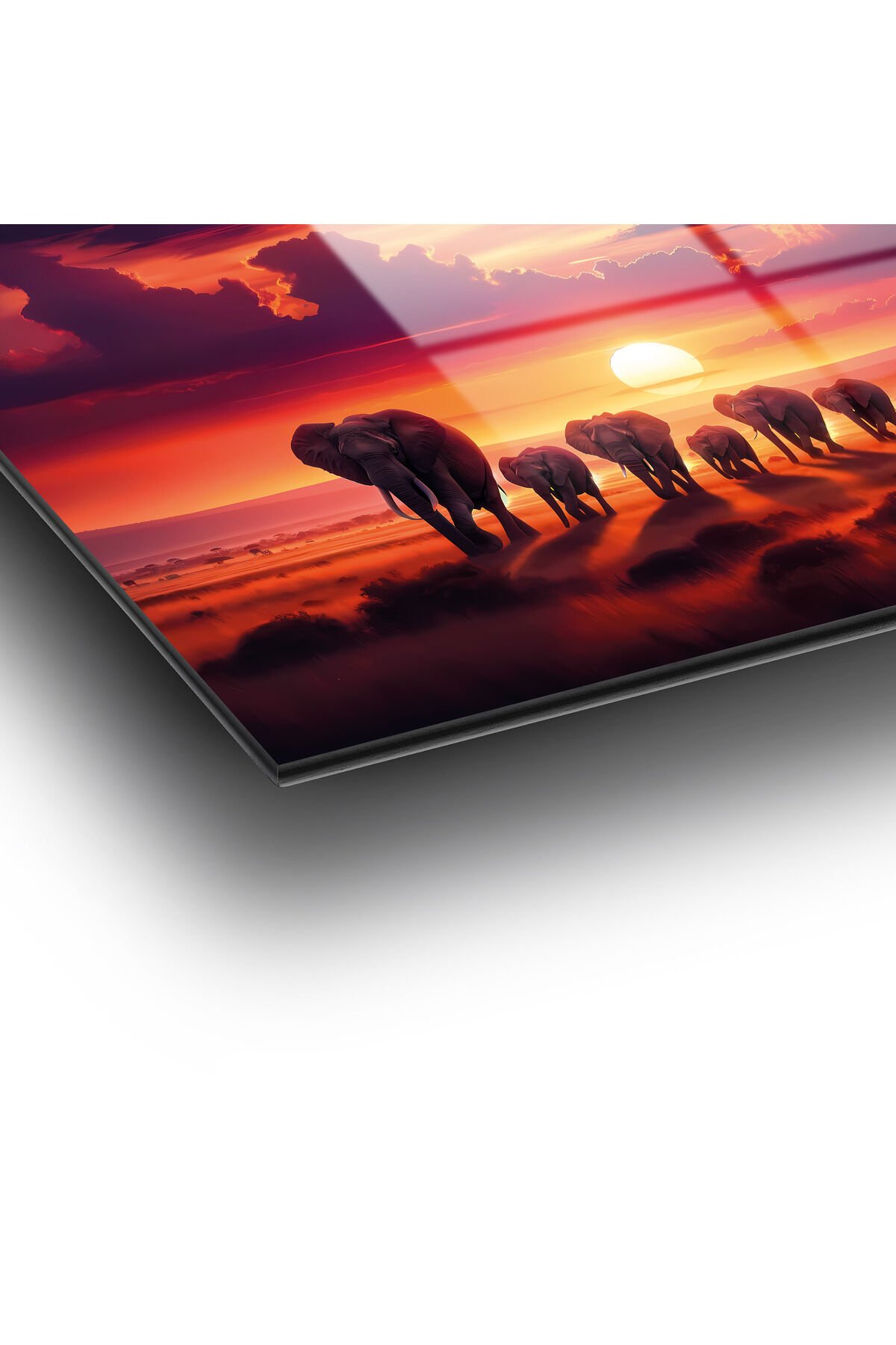 Günbatımı Manzara ve Filler Modern Soyut Cam Tablo Ev Ofis Salon Hediyelik Soyut Büyük Tablo Kırmızı