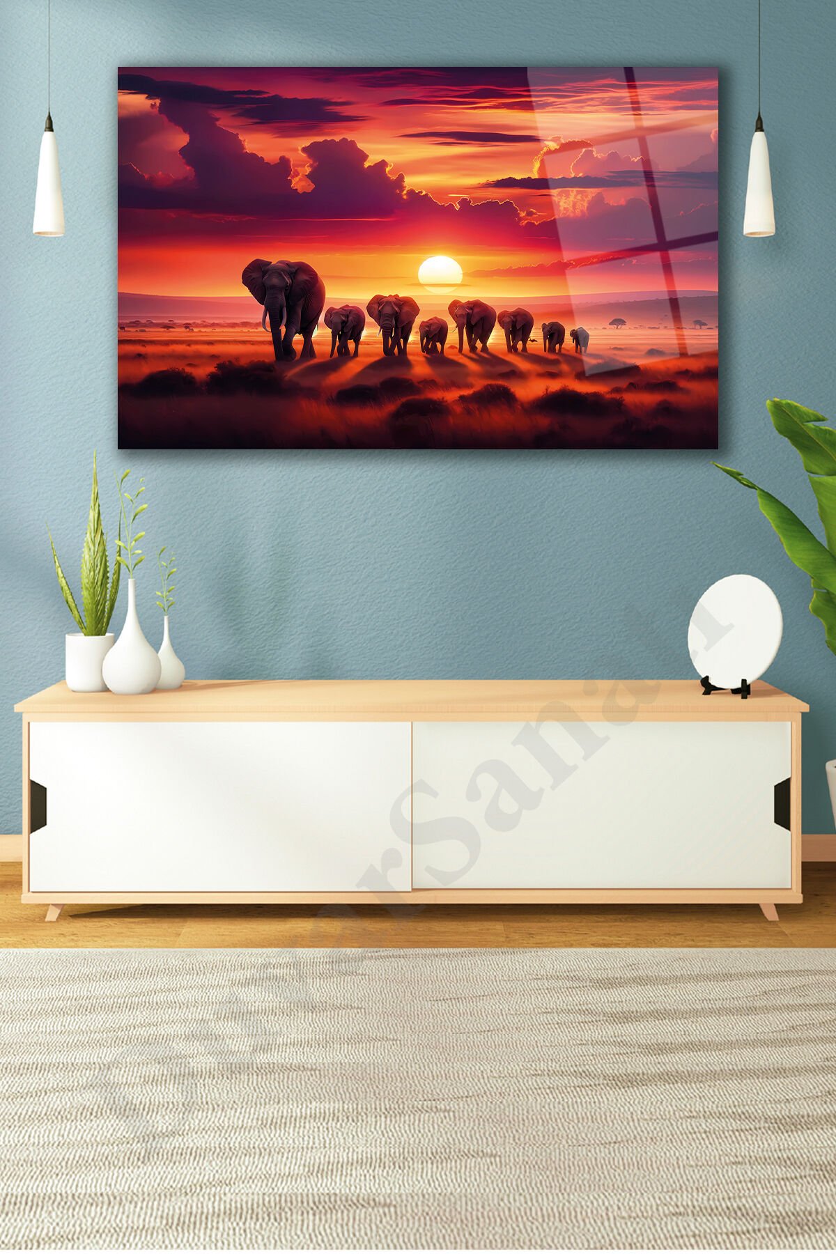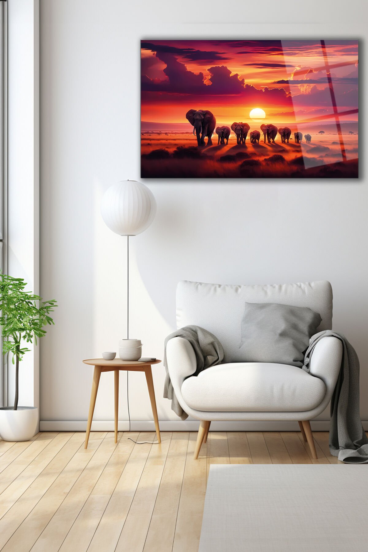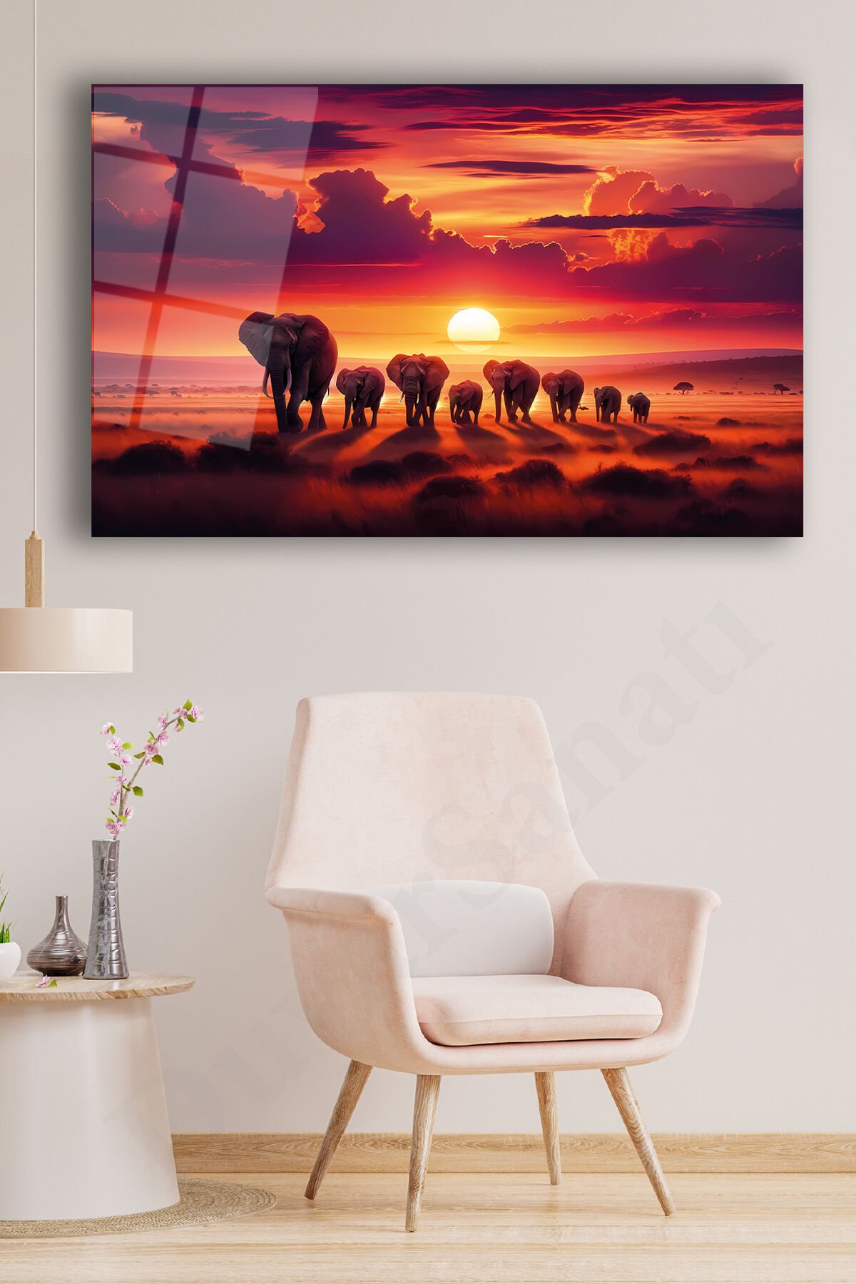 Günbatımı Manzara ve Filler Modern Soyut Cam Tablo Ev Ofis Salon Hediyelik Soyut Büyük Tablo Kırmızı