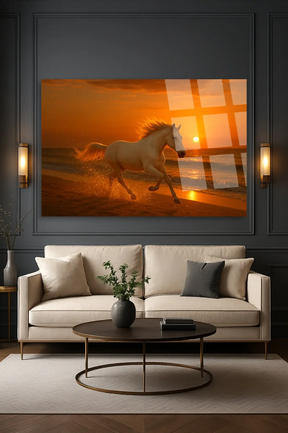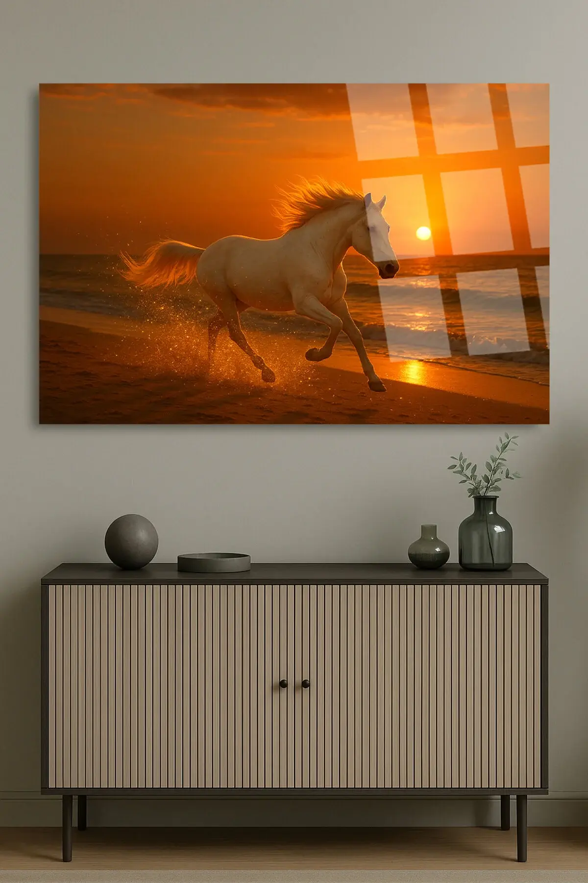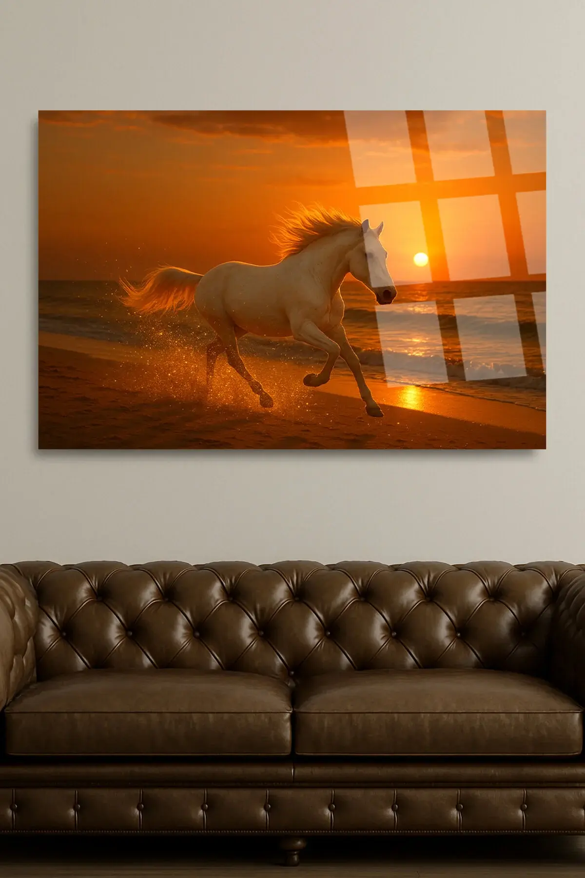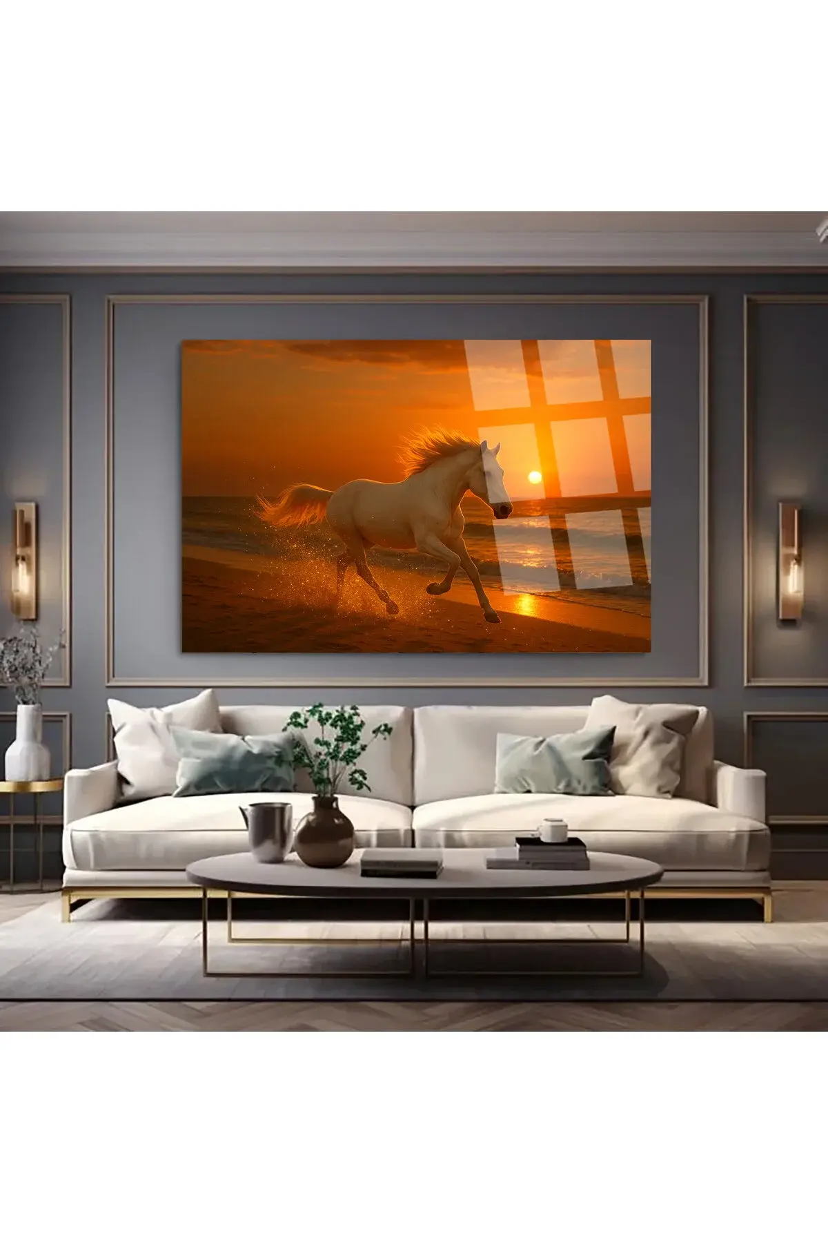 GÜNBATIMINDA SAHİLDE KOŞAN SİYAH AT KIRILMAZ CAM TABLO LÜKS MODERN TABLO EV HEDİYESİ Turuncu
