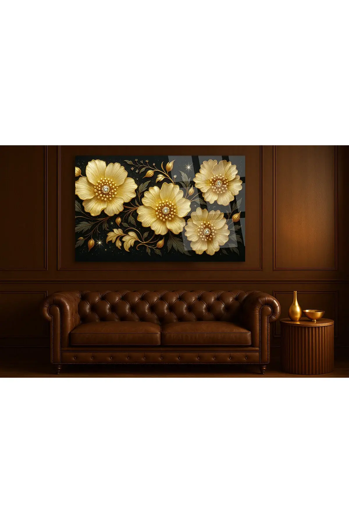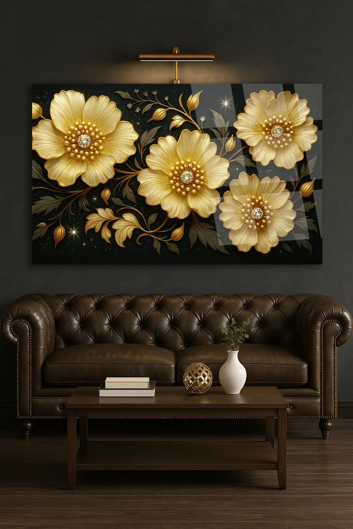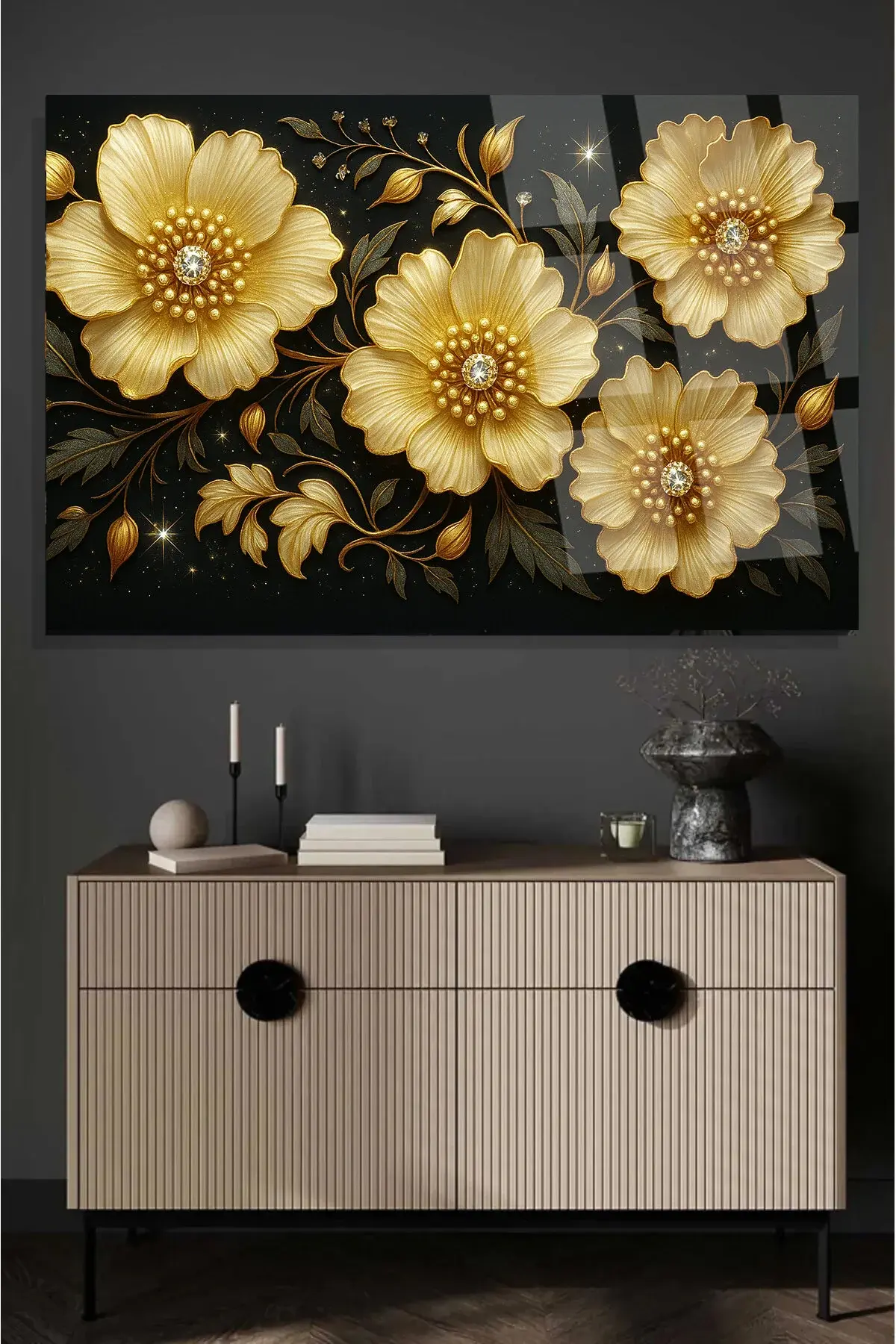 HARİKA ÇİÇEK TASARIMI PARILDAYAN VE IŞIK SAÇAN DETAYLAR KIRILMAZ CAM TABLO LÜKS HEDİYE Siyah