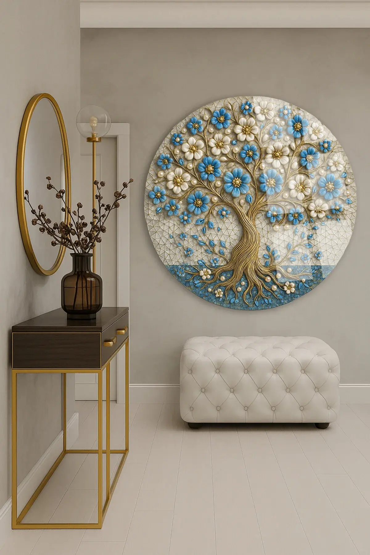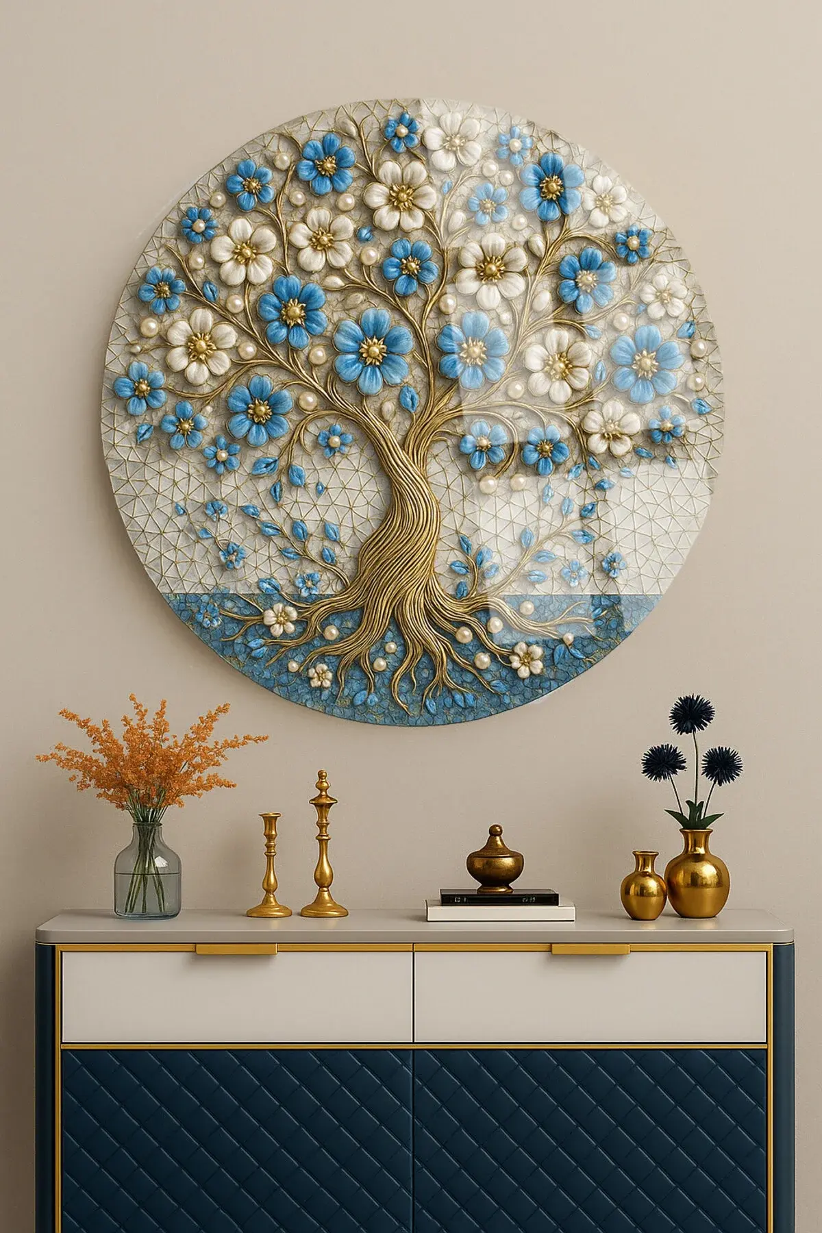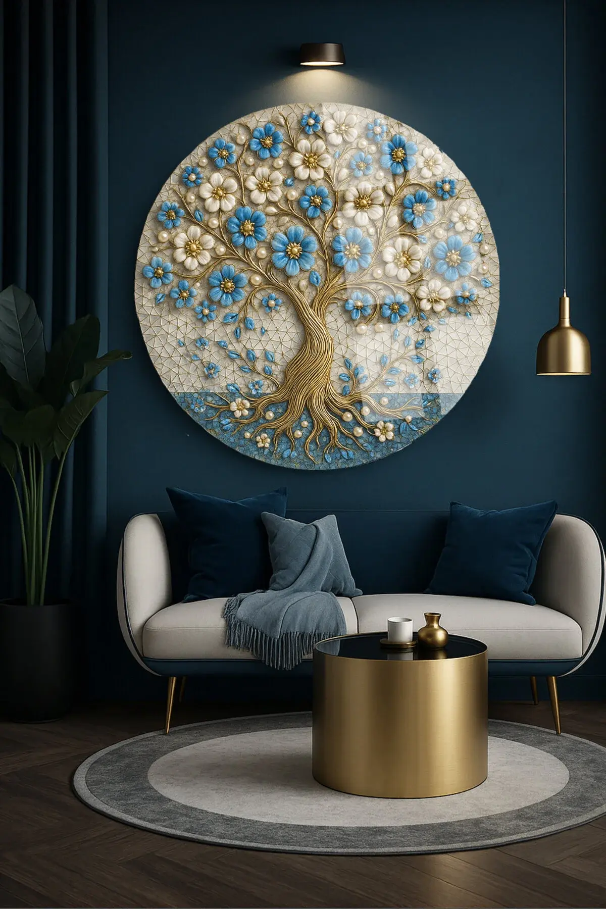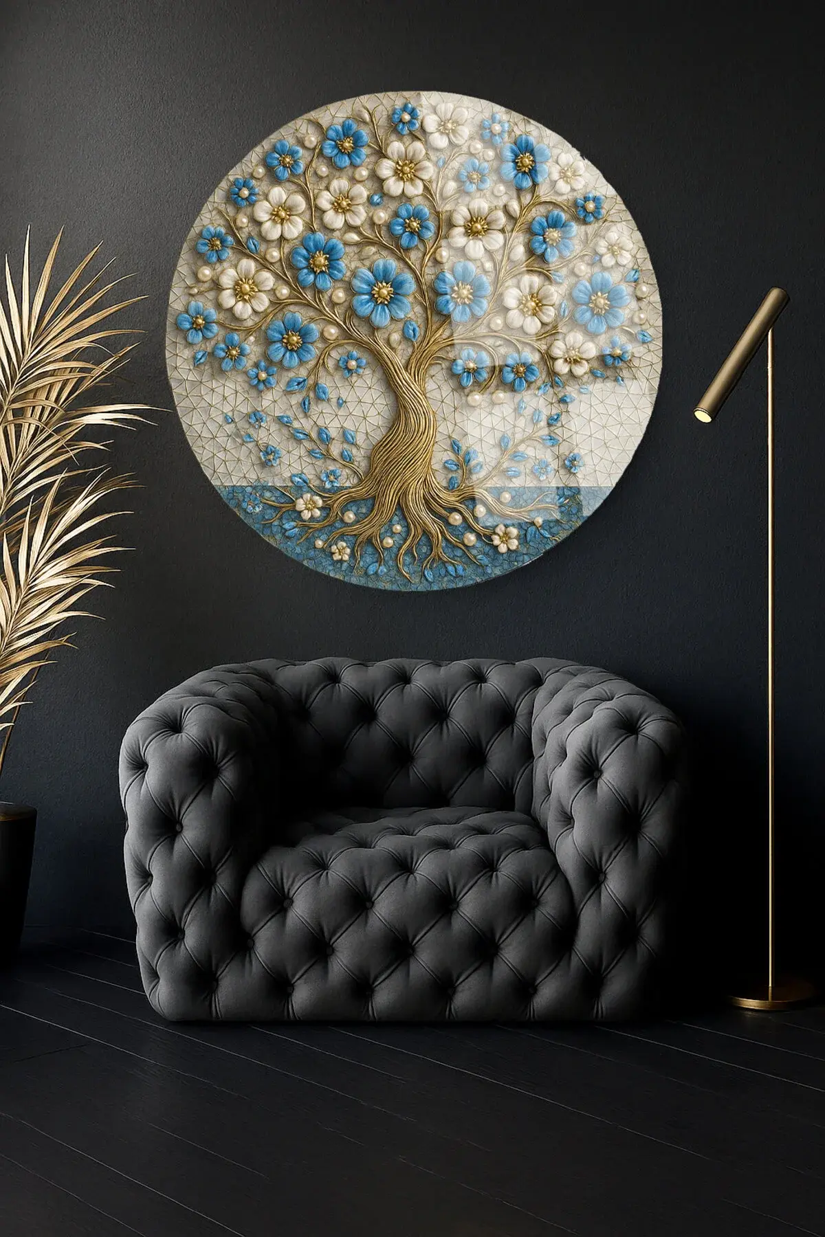 HARİKA MAVİ YAPRAKLI AĞAÇ TASARIMI MODERN YUVARLAK KIRILMAZ CAM TABLO LÜKS HEDİYE TABLO Mavi