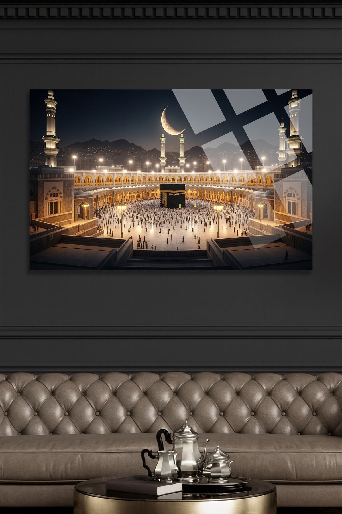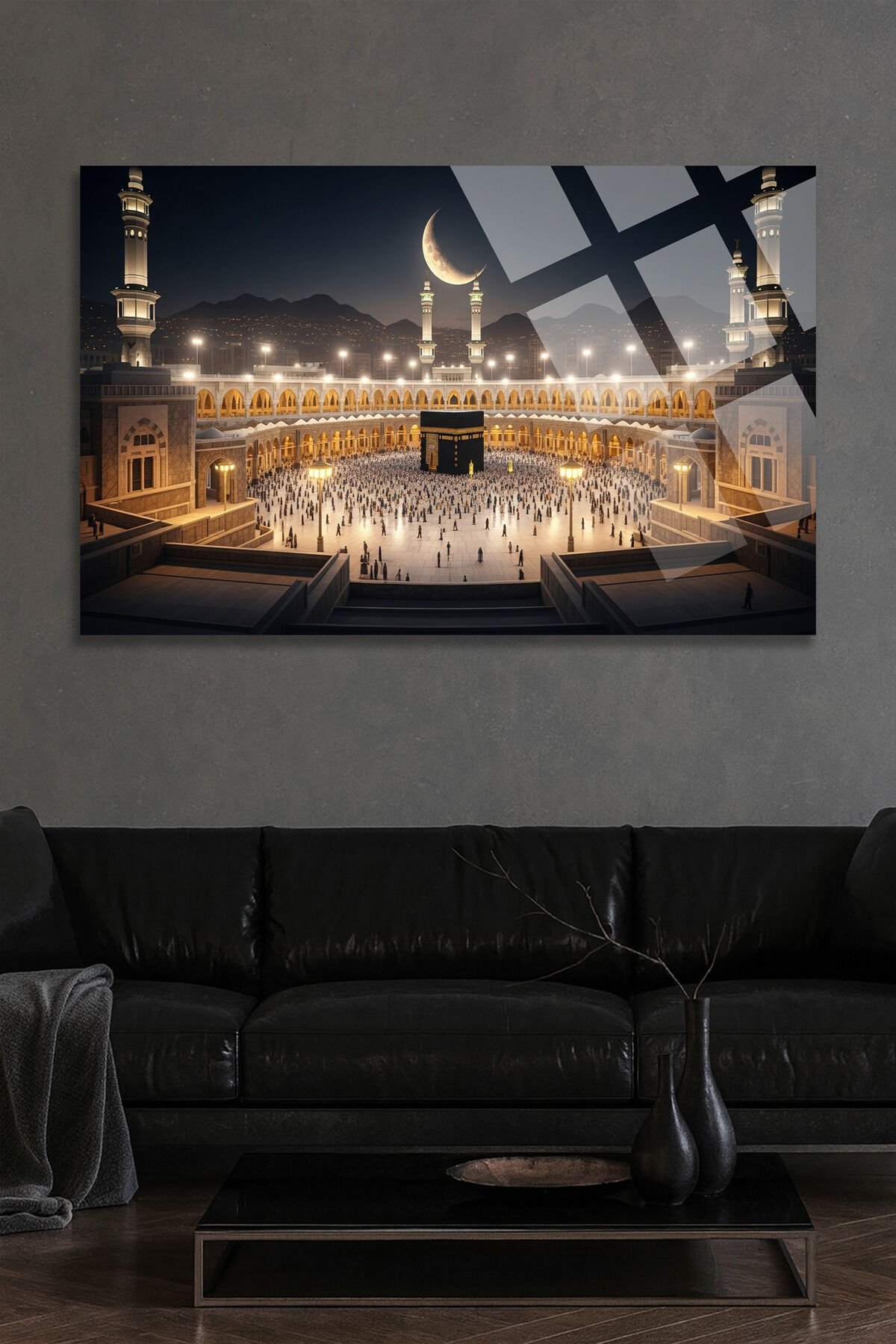 Harika Yapay Zeka Kâbe ve Mescid-i Haram Gece Görünümü Cam Tablo – İslami Tablo Dini Tablo Siyah