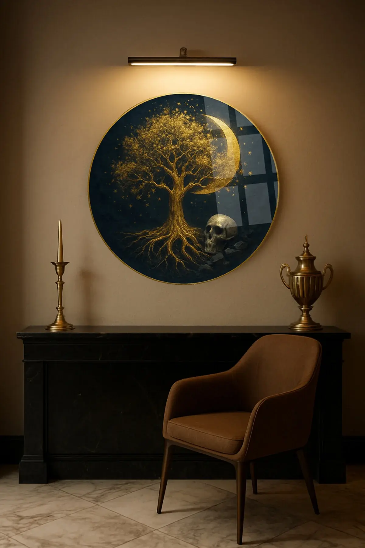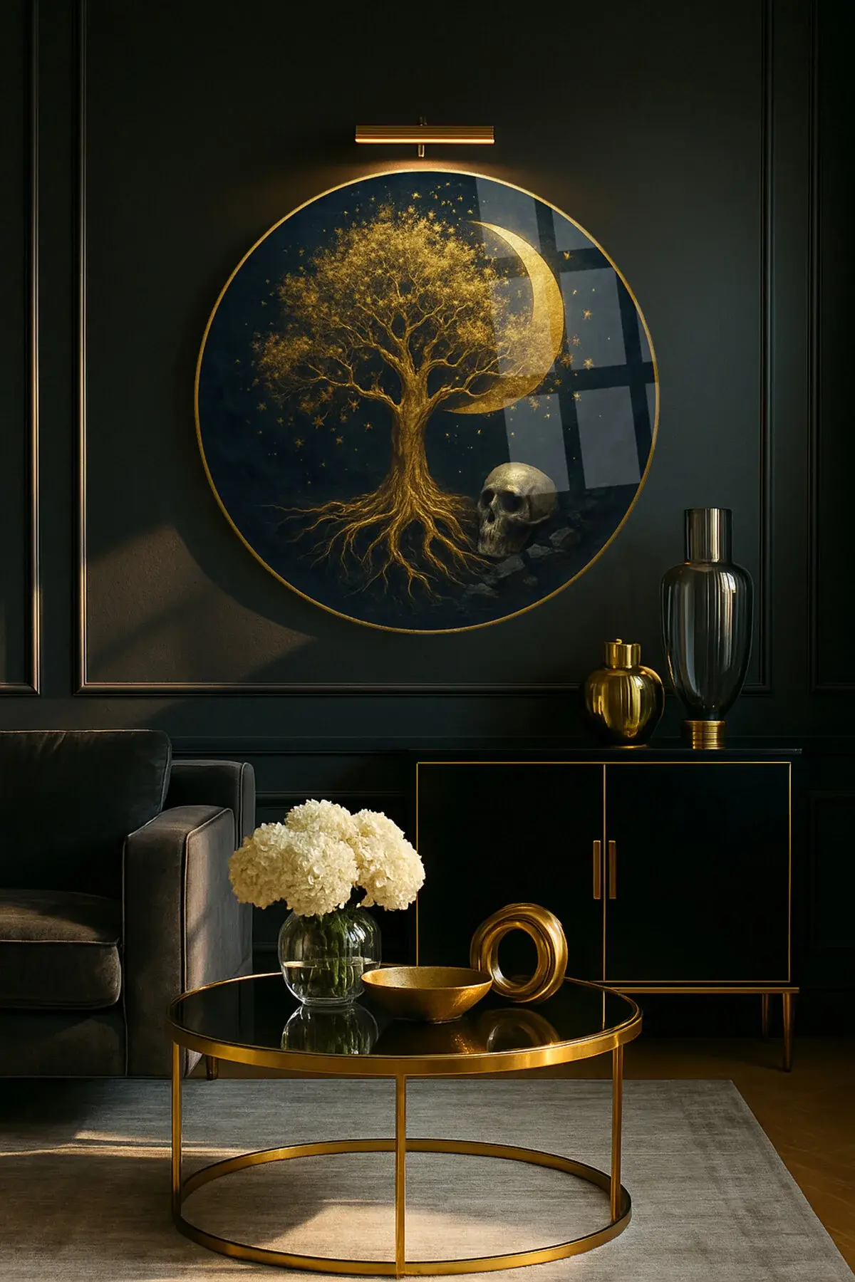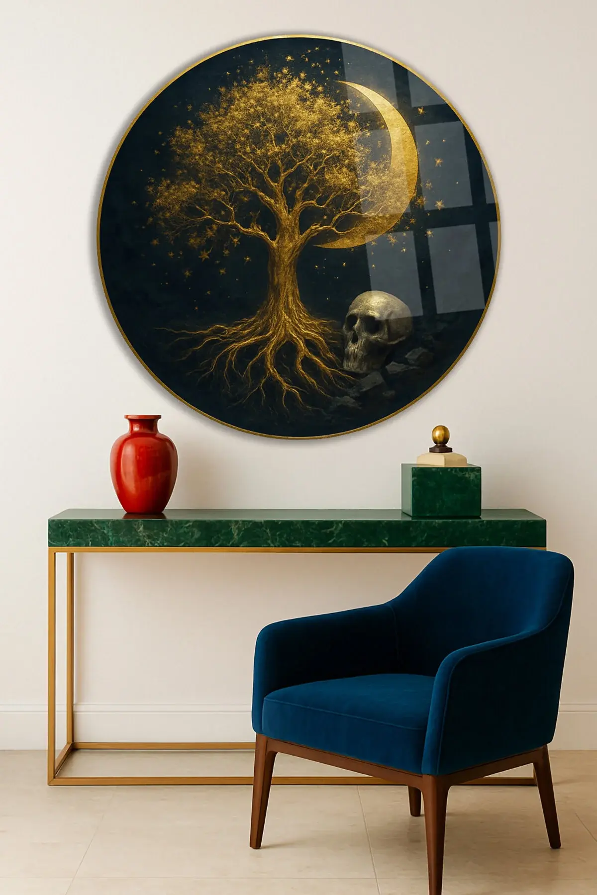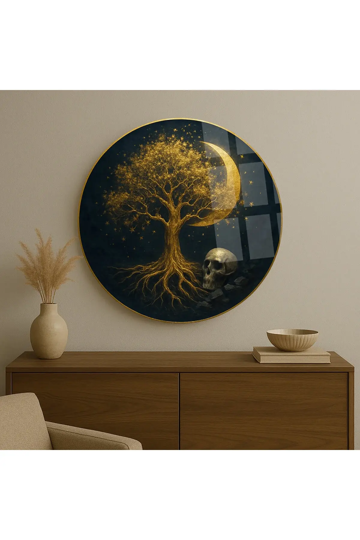 HAYAT DÖNGÜSÜ TASARIMI KIRILMAZ YUVARLAK CAM TABLO LÜKS EV HEDİYESİ ULTRA CANLI RENKLİ Lacivert