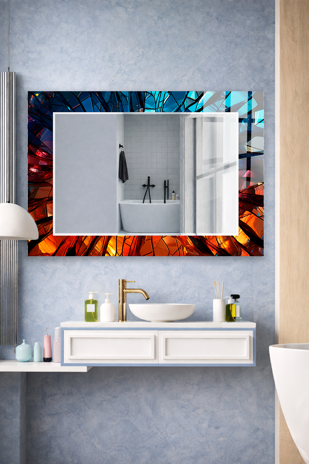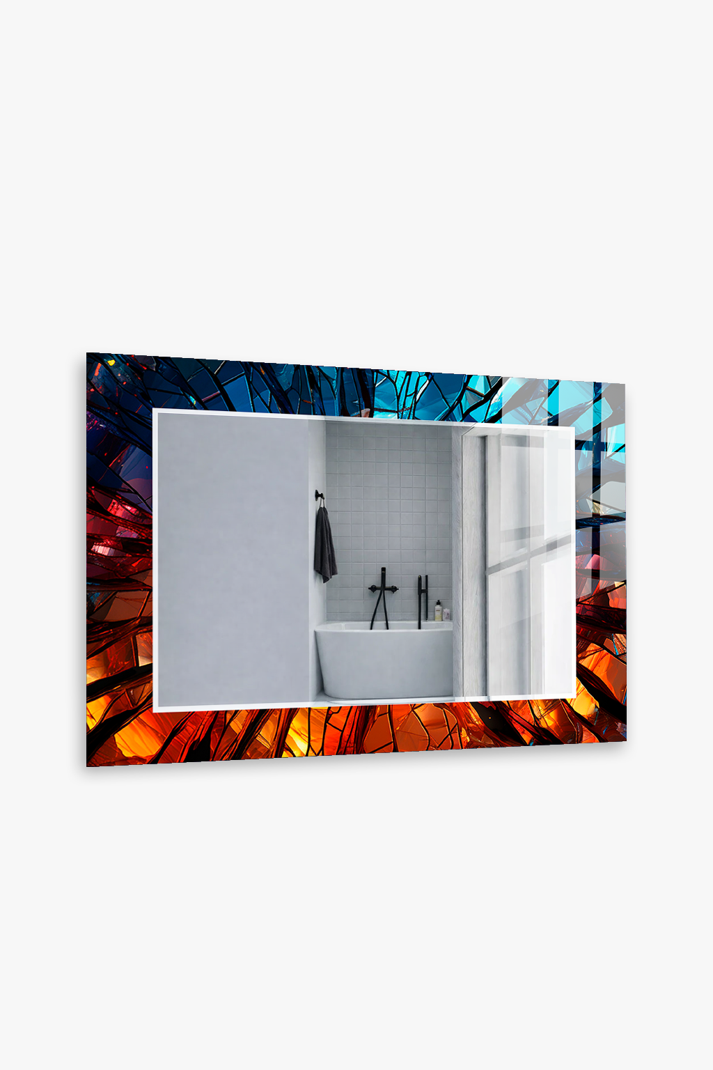 Hem tablo hem ayna formundaki bu dekoratif duvar aynası, bulunduğu mekâna derinlik, ışık ve zarafet kazandıran tamamlayıcı bir tasarım ürünüdür.