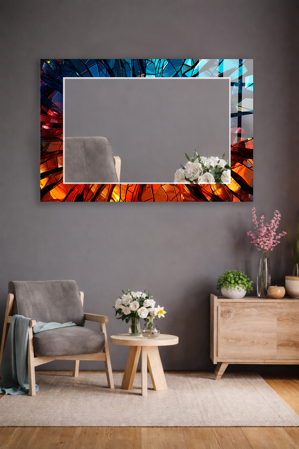 HEM TABLO HEM AYNA ALEV TONLARI SOYUT SANAT CAM DUVAR AYNASI EV DEKORU