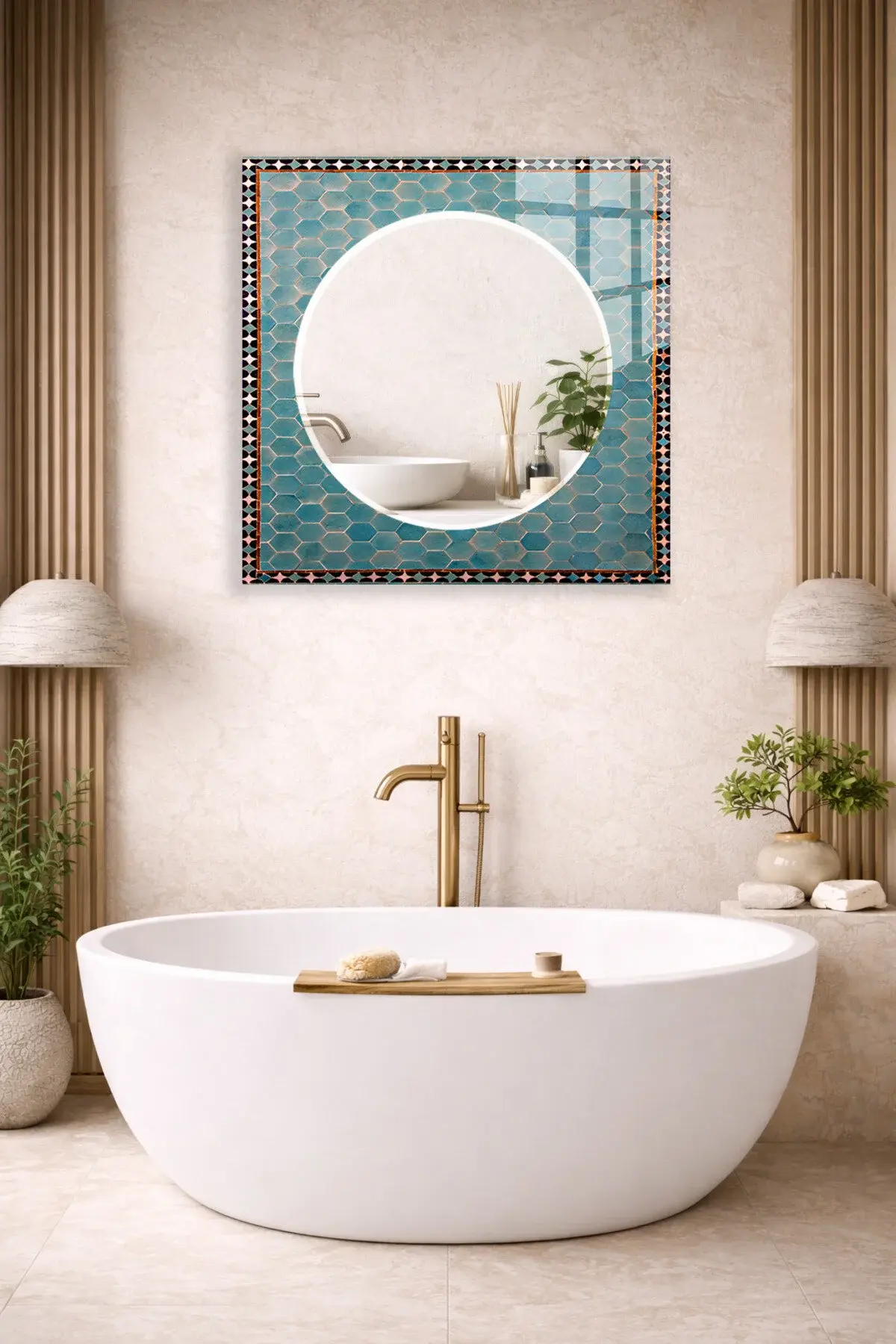 HEM TABLO HEM AYNA ALTIGEN ÇİNİ DESEN TURKUAZ CAM DUVAR AYNASI EV DEKORU