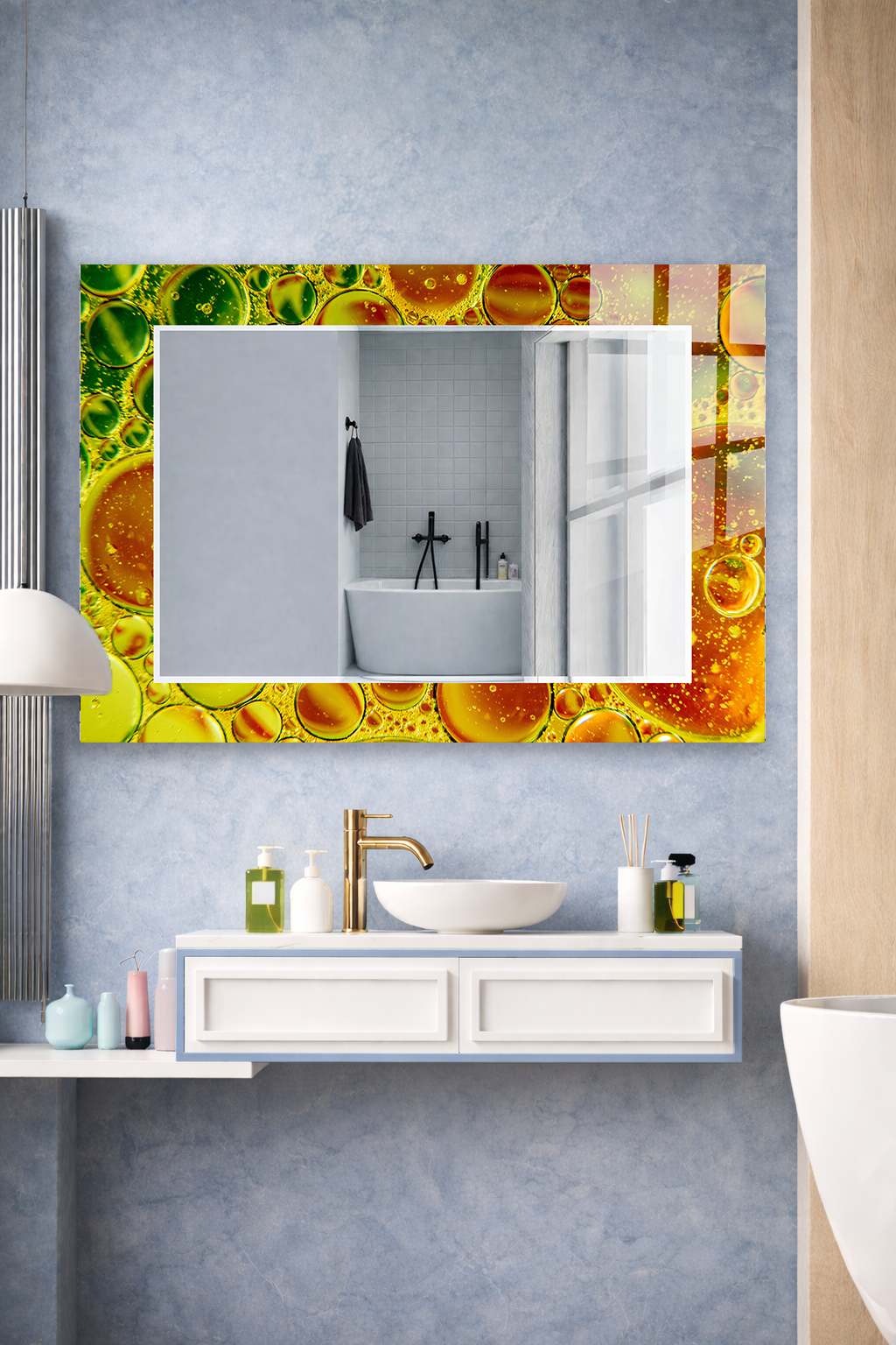 Hem dekoratif bir duvar objesi hem de kullanışlı bir ayna olarak tasarlanan bu özel ürün, ev ve ofis dekorasyonuna modern ve ferah bir atmosfer katar.