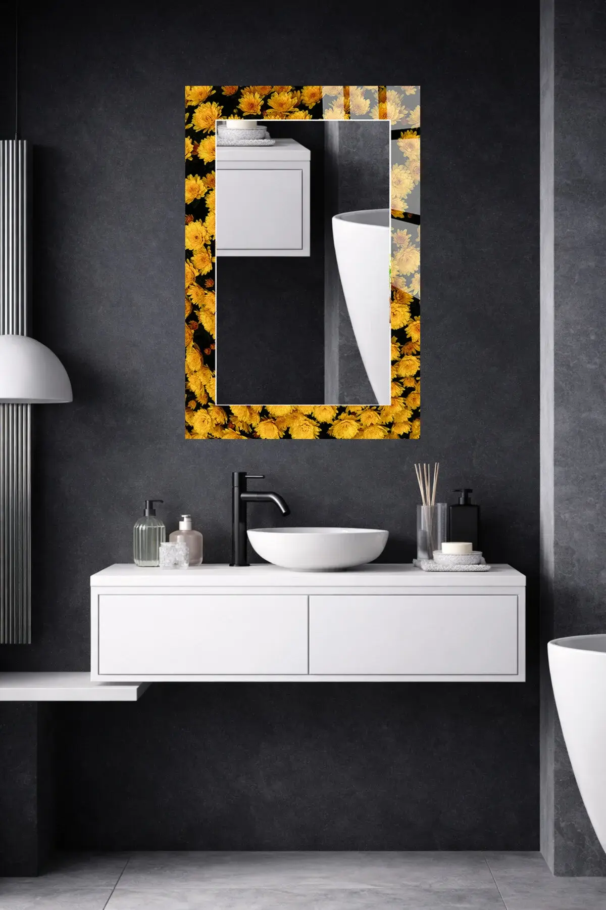 HEM TABLO HEM AYNA AYNA TASARIM SARI ÇİÇEK DESENLİ CAM DUVAR AYNASI CANLI VE FERAH EV DEKORU