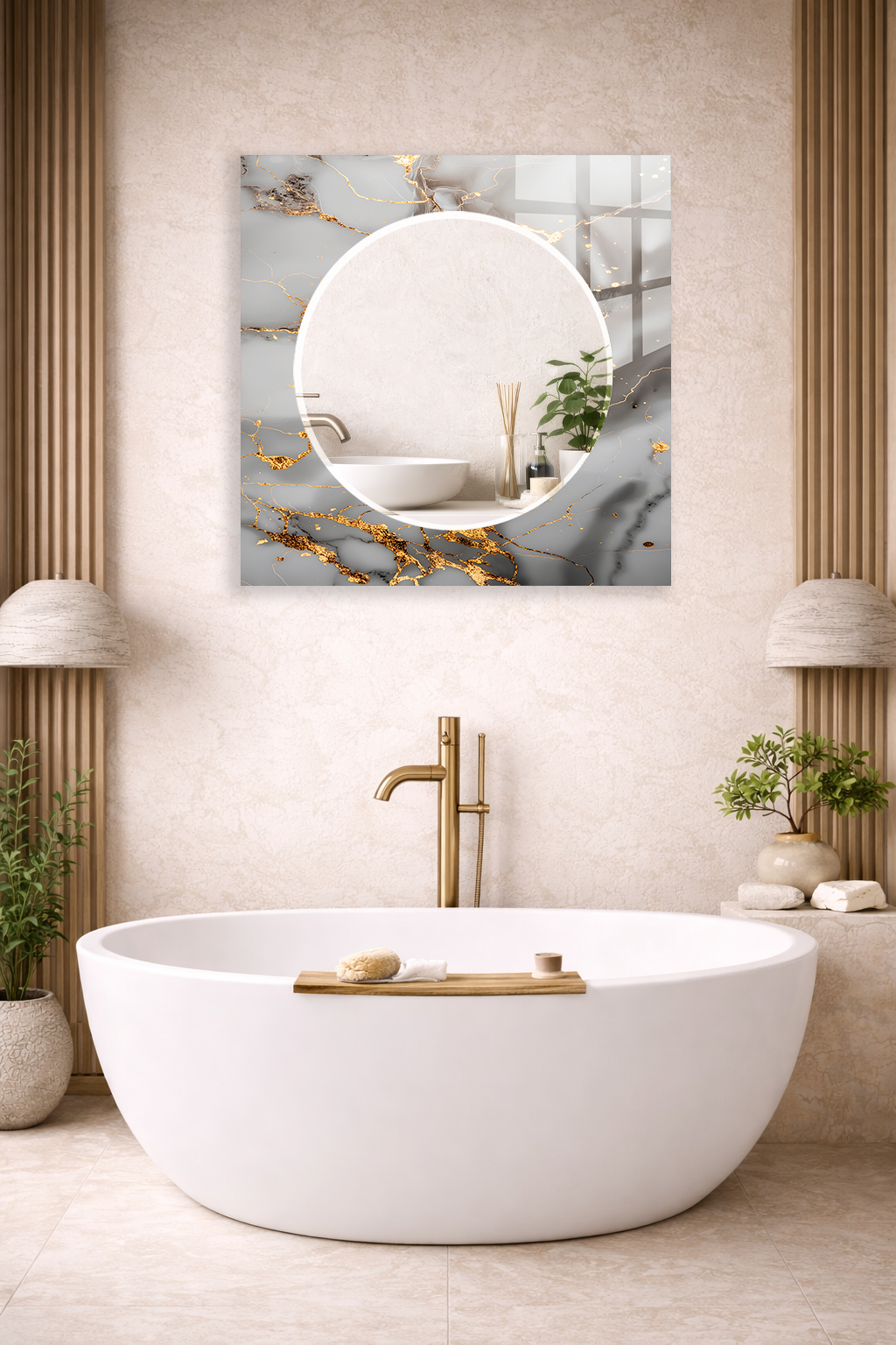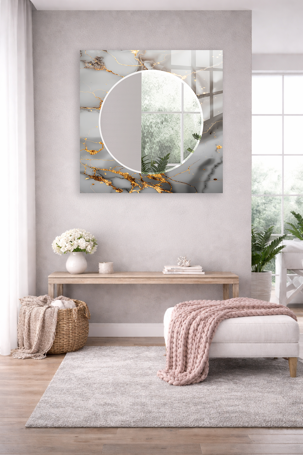 HEM TABLO HEM AYNA BEYAZ MERMER ALTIN DAMARLI ŞIK TASARIM CAM DUVAR AYNASI EV DEKORU