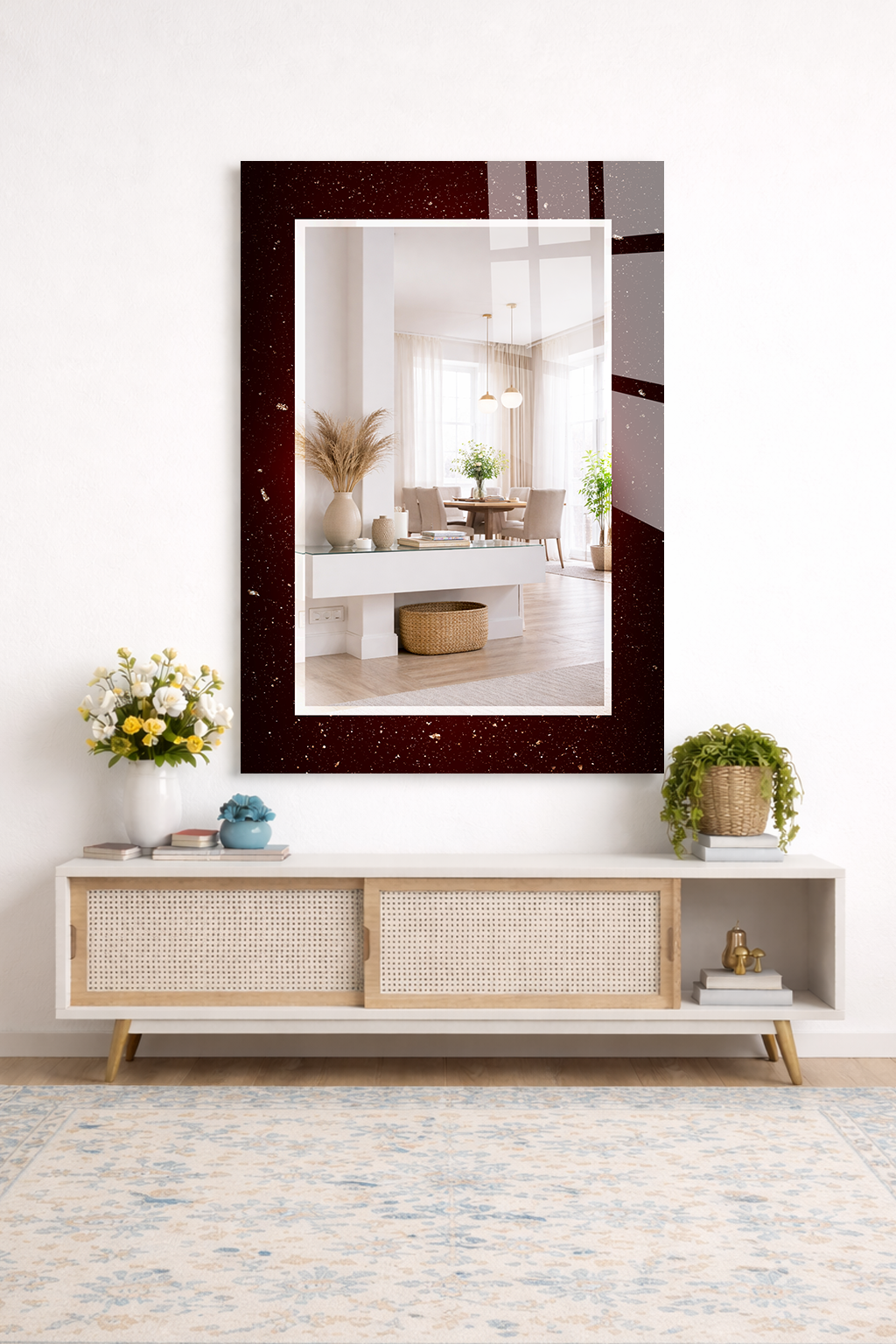 Dekoratif duvar aynası, tablo estetiği ile aynanın işlevselliğini bir araya getirerek yaşam alanlarına şıklık kazandırır.