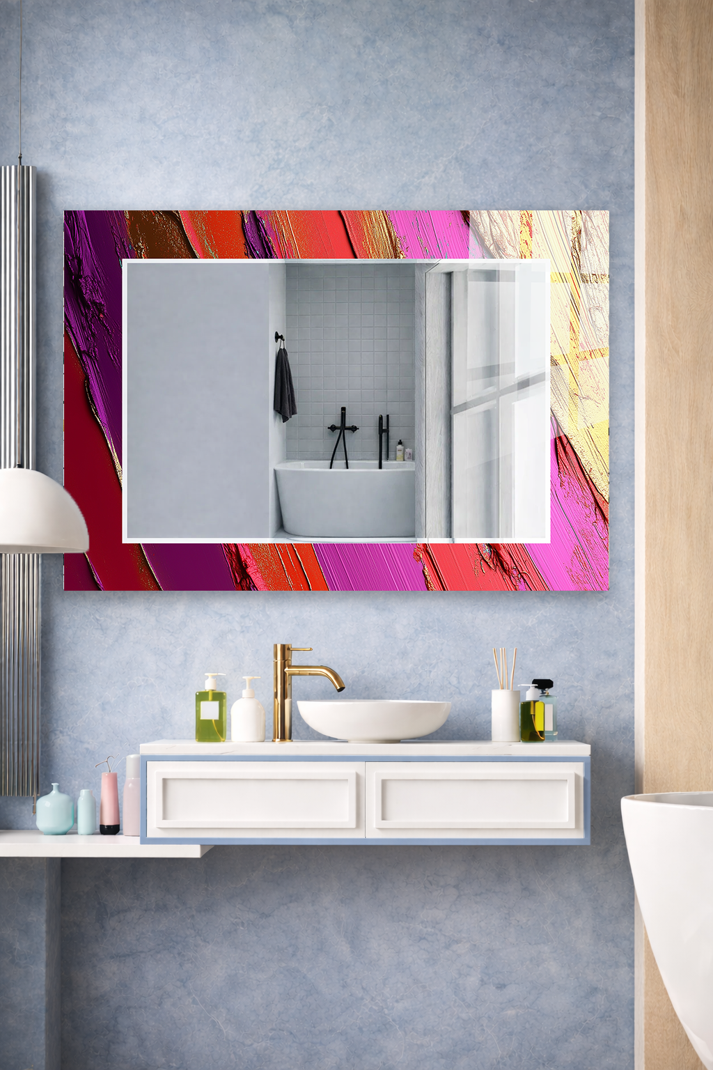 Hem tablo hem ayna formundaki bu dekoratif duvar aynası, bulunduğu mekâna derinlik, ışık ve zarafet kazandıran tamamlayıcı bir tasarım ürünüdür.