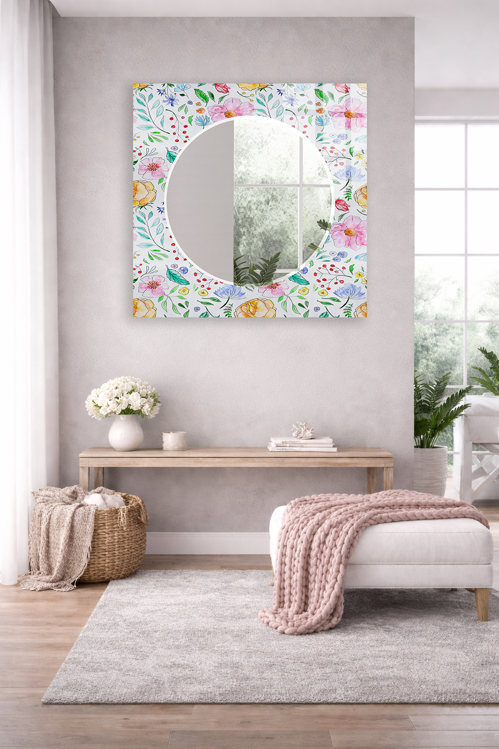 HEM TABLO HEM AYNA ÇİÇEK İLLÜSTRASYONLU CAM DUVAR AYNASI EV DEKORU