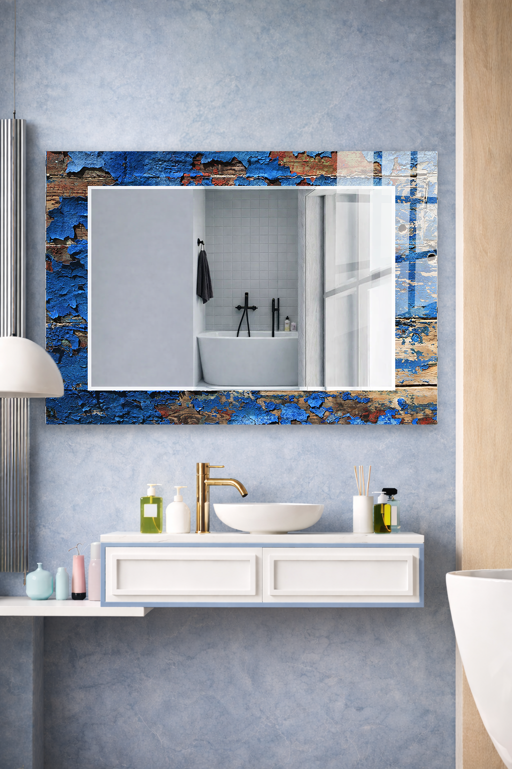 Hem tablo hem ayna formundaki bu dekoratif duvar aynası, bulunduğu mekâna derinlik, ışık ve zarafet kazandıran tamamlayıcı bir tasarım ürünüdür.