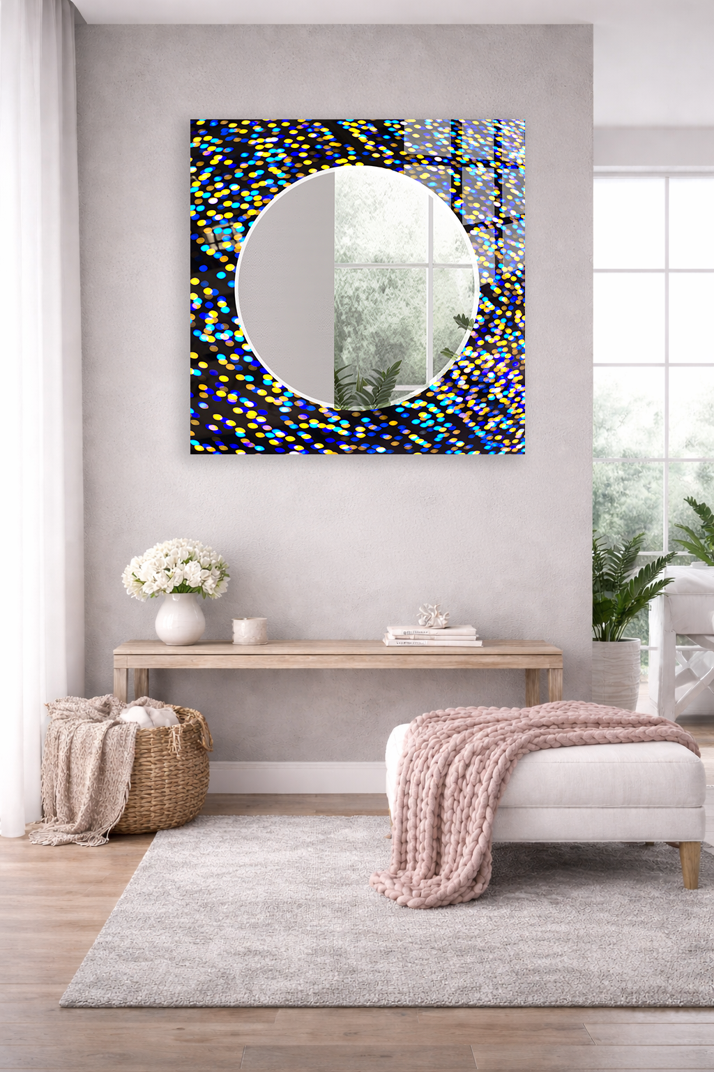 HEM TABLO HEM AYNA IŞILTILI BOKEH NOKTA DESEN CAM DUVAR AYNASI EV DEKORU