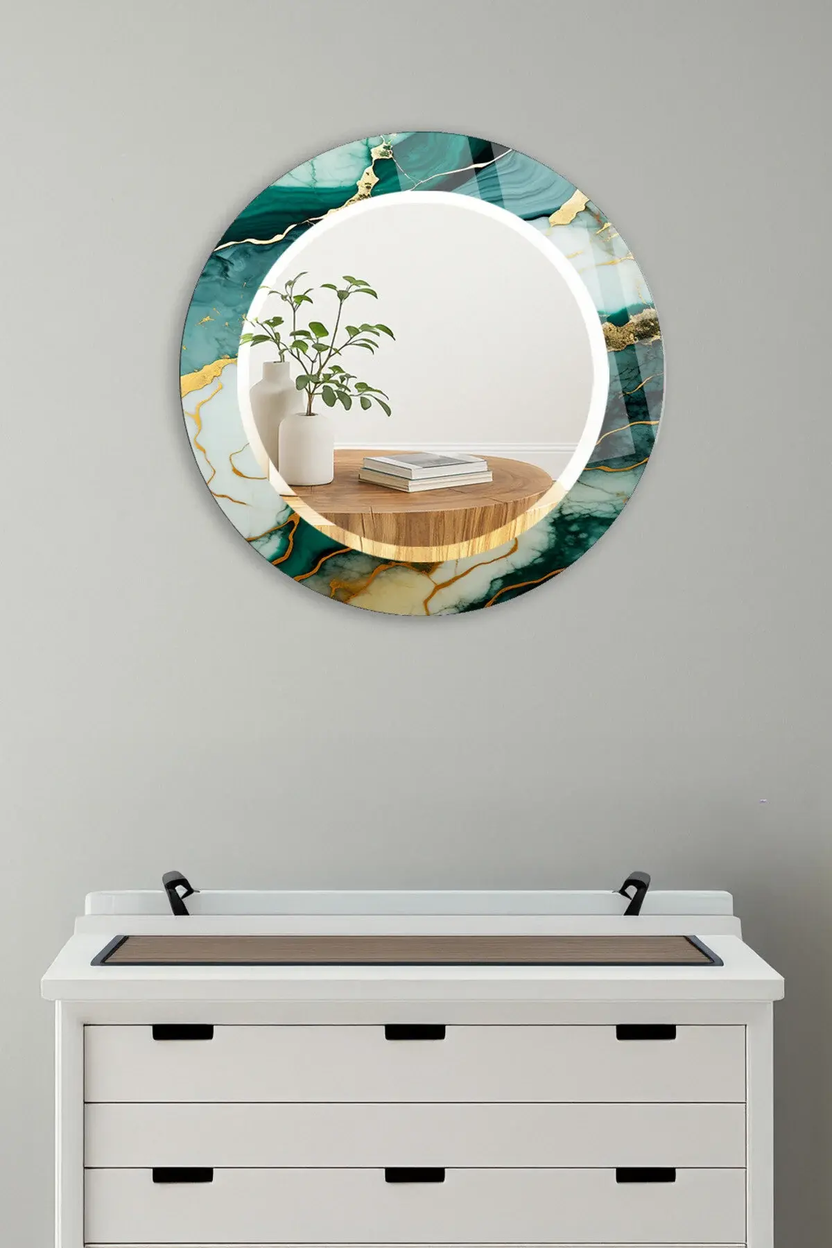 HEM TABLO HEM AYNA KIRILMAZ TEMPERLİ CAM DUVAR AYNASI TURKUAZ YEŞİL DOKULU DESEN EV OFİS HEDİYESİ