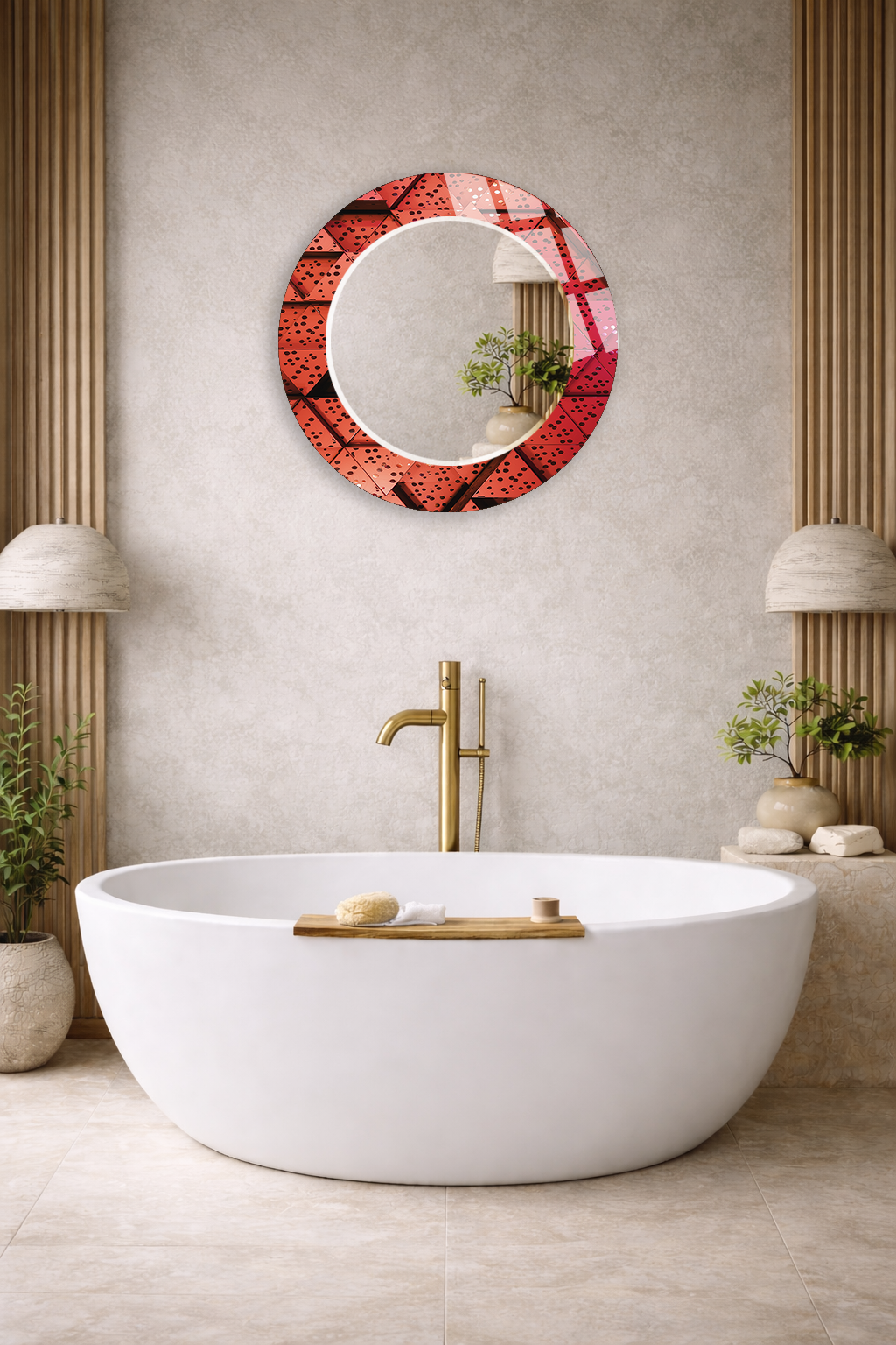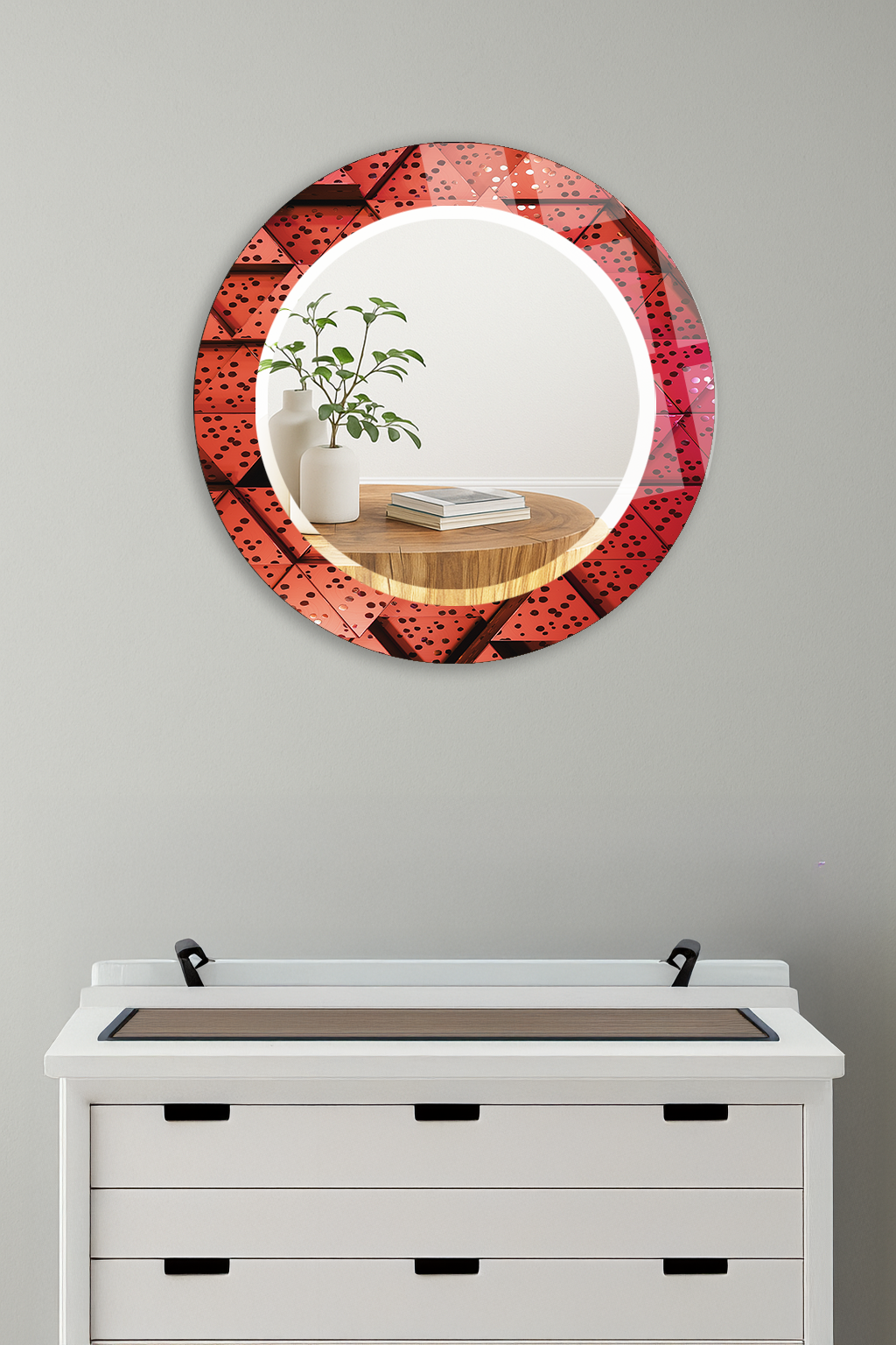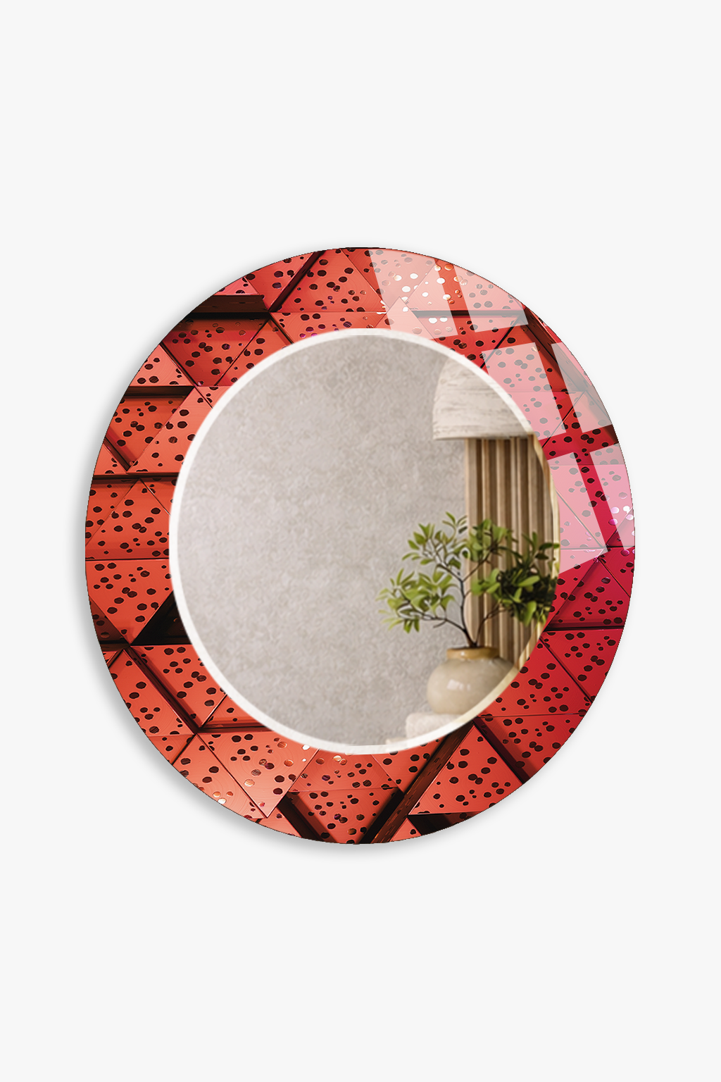 HEM TABLO HEM AYNA KIRMIZI GEOMETRİK DESENLİ CAM DUVAR AYNASI EV DEKORU