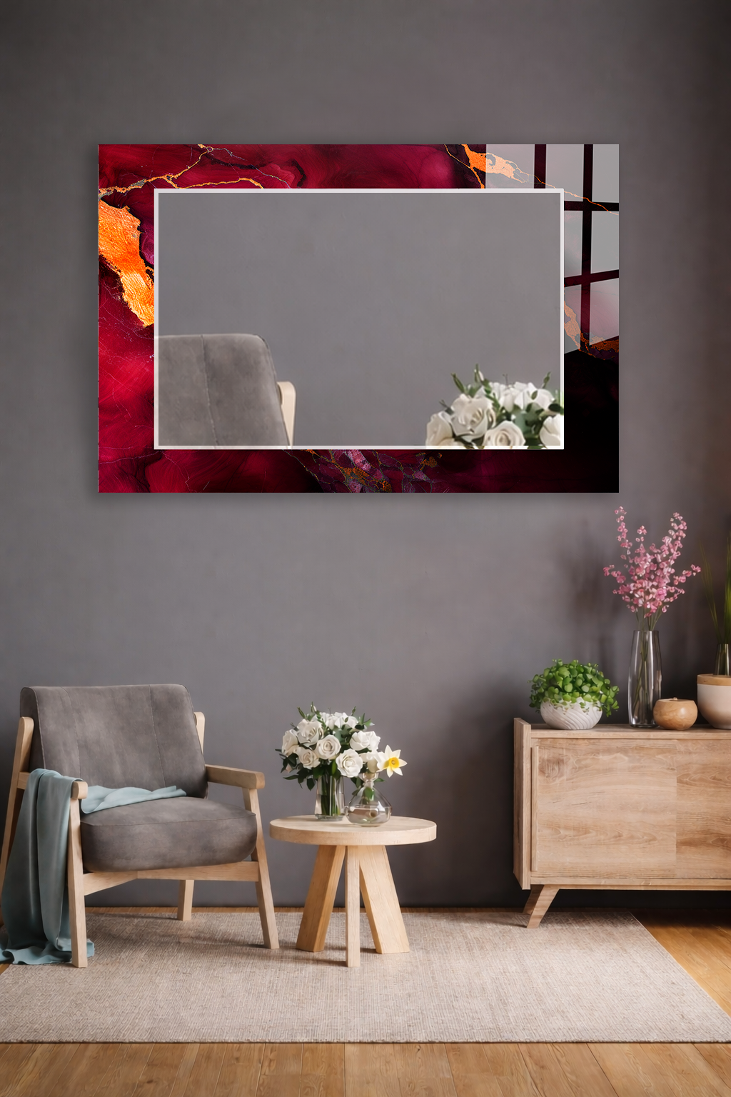 HEM TABLO HEM AYNA KIRMIZI MERMER ALTIN VARAK DESEN CAM DUVAR AYNASI EV DEKORU