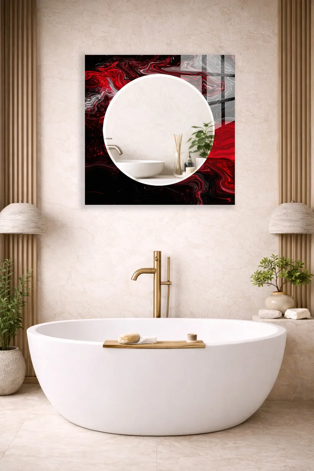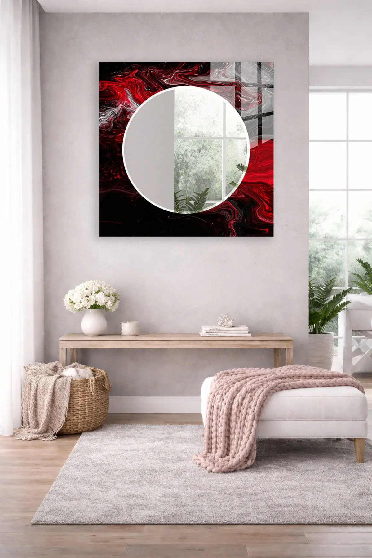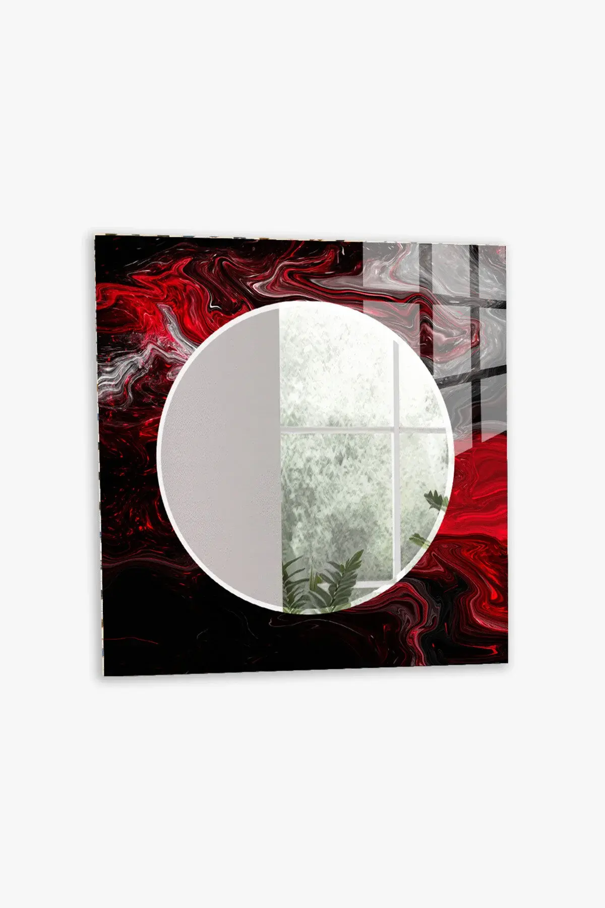 HEM TABLO HEM AYNA KIRMIZI SİYAH AKIŞKAN DESEN CAM DUVAR AYNASI EV DEKORU