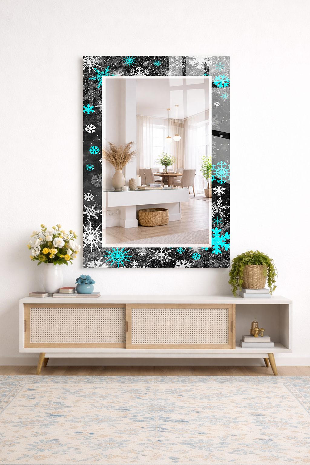 HEM TABLO HEM AYNA KIŞ TEMALI KAR TANESİ DESEN CAM DUVAR AYNASI EV DEKORU