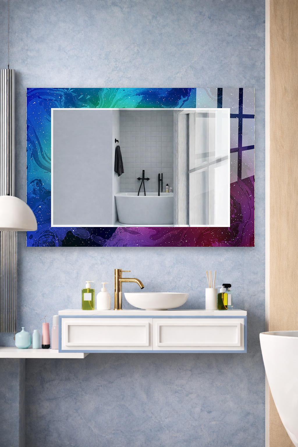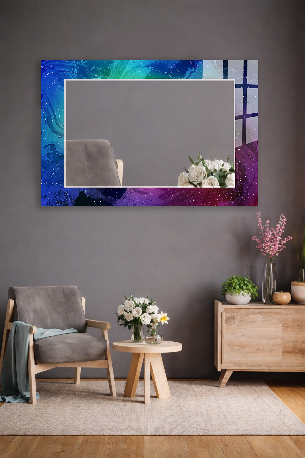 HEM TABLO HEM AYNA KOZMİK BULUT SOYUT UZAY DESEN CAM DUVAR AYNASI EV DEKORU