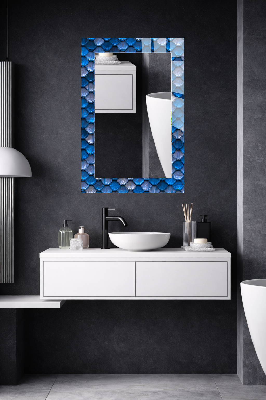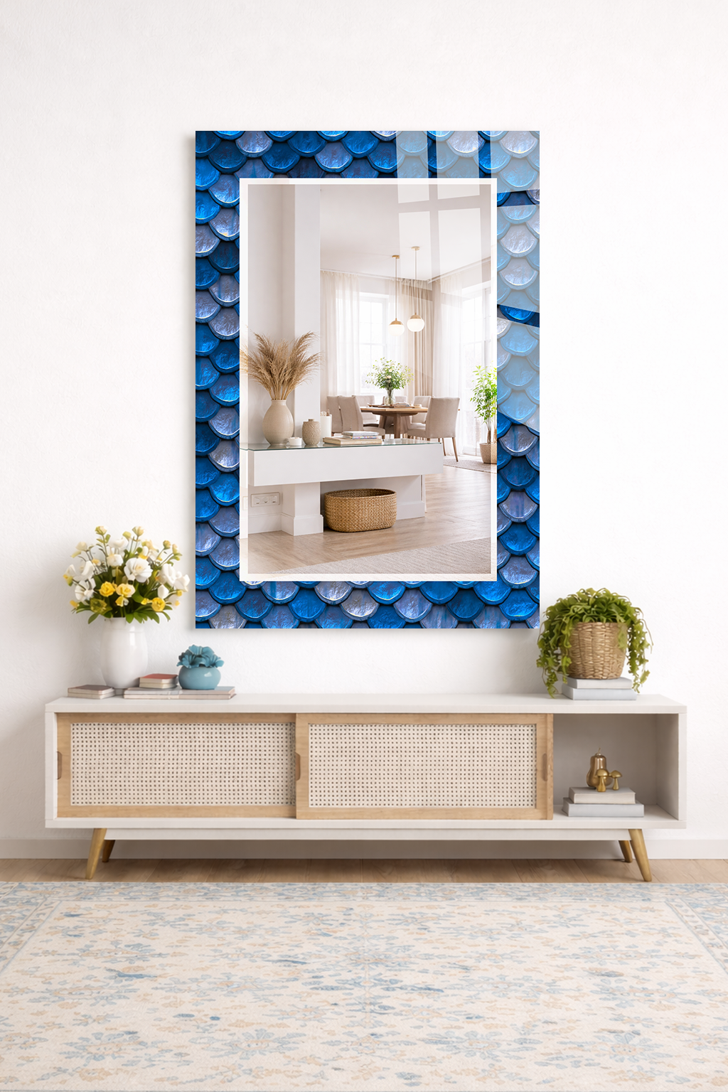 HEM TABLO HEM AYNA MAVİ BALIK PULU DESEN CAM DUVAR AYNASI EV DEKORU