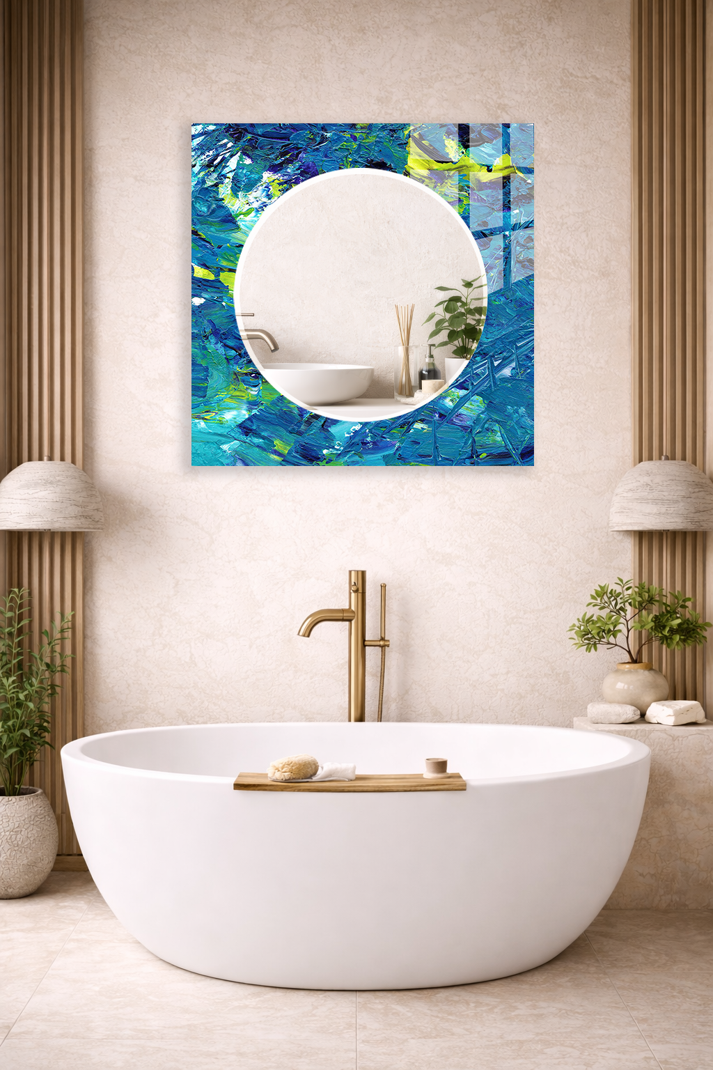HEM TABLO HEM AYNA MAVİ FIRÇA DARBELİ SANATSAL DESEN CAM DUVAR AYNASI EV DEKORU