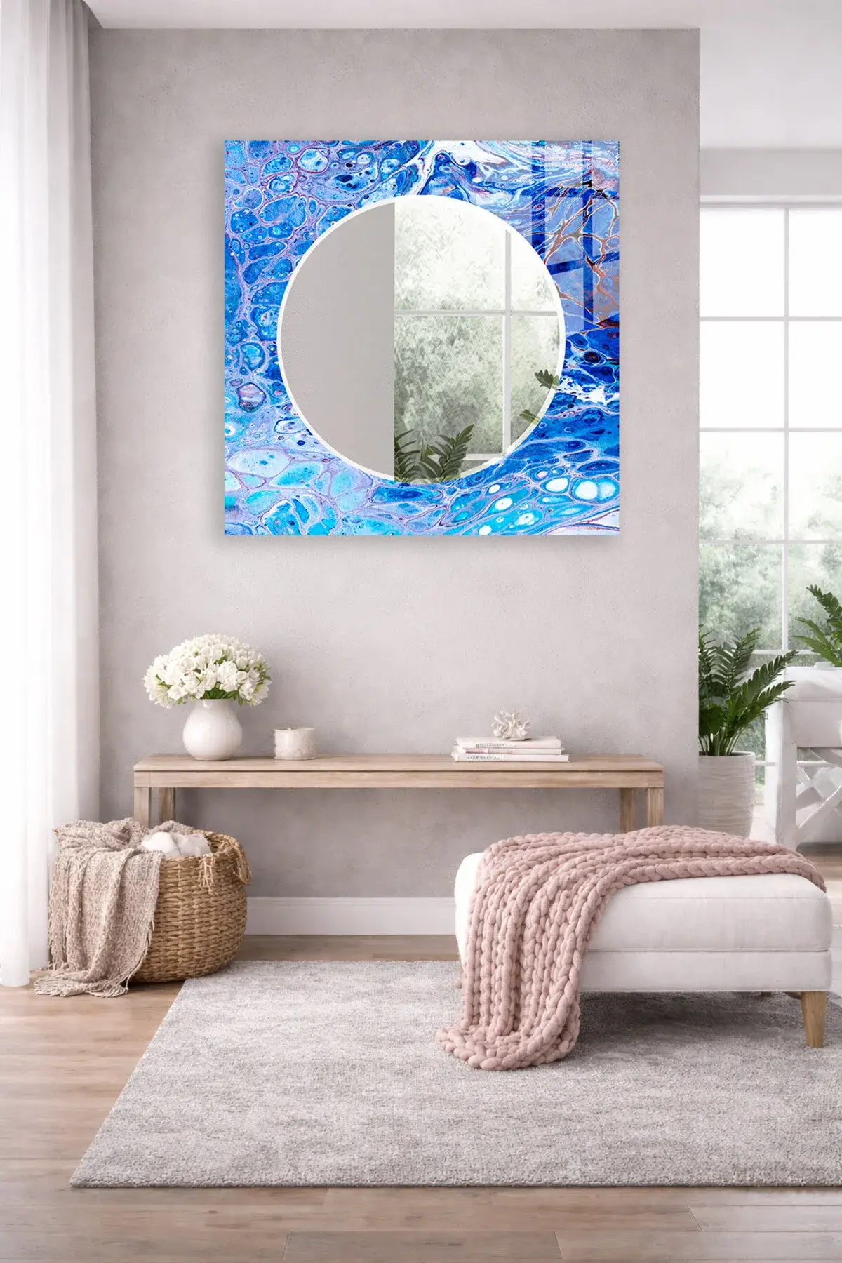 Hem dekoratif bir duvar objesi hem de kullanışlı bir ayna olarak tasarlanan bu özel ürün, ev ve ofis dekorasyonuna modern ve ferah bir atmosfer katar.