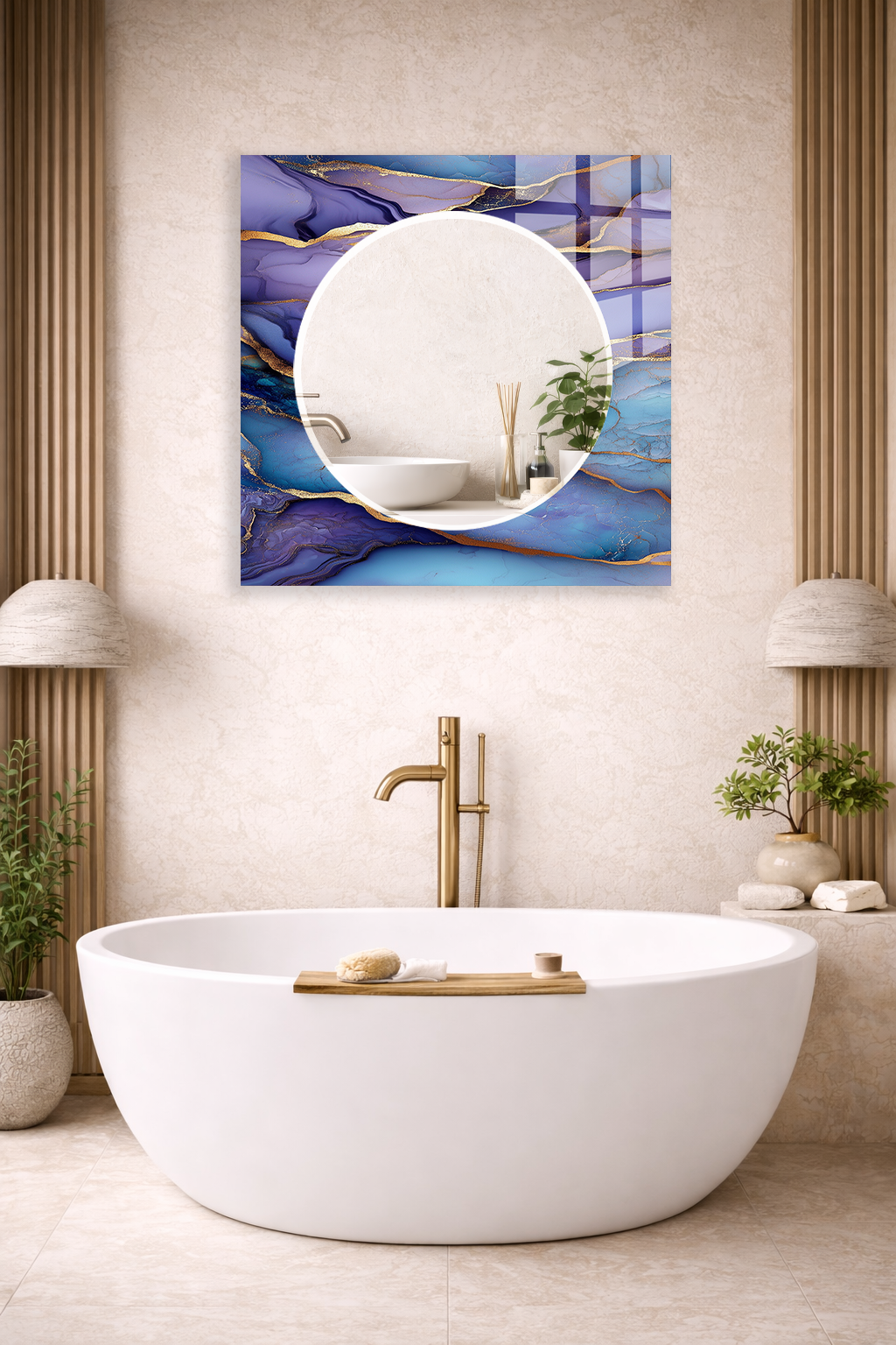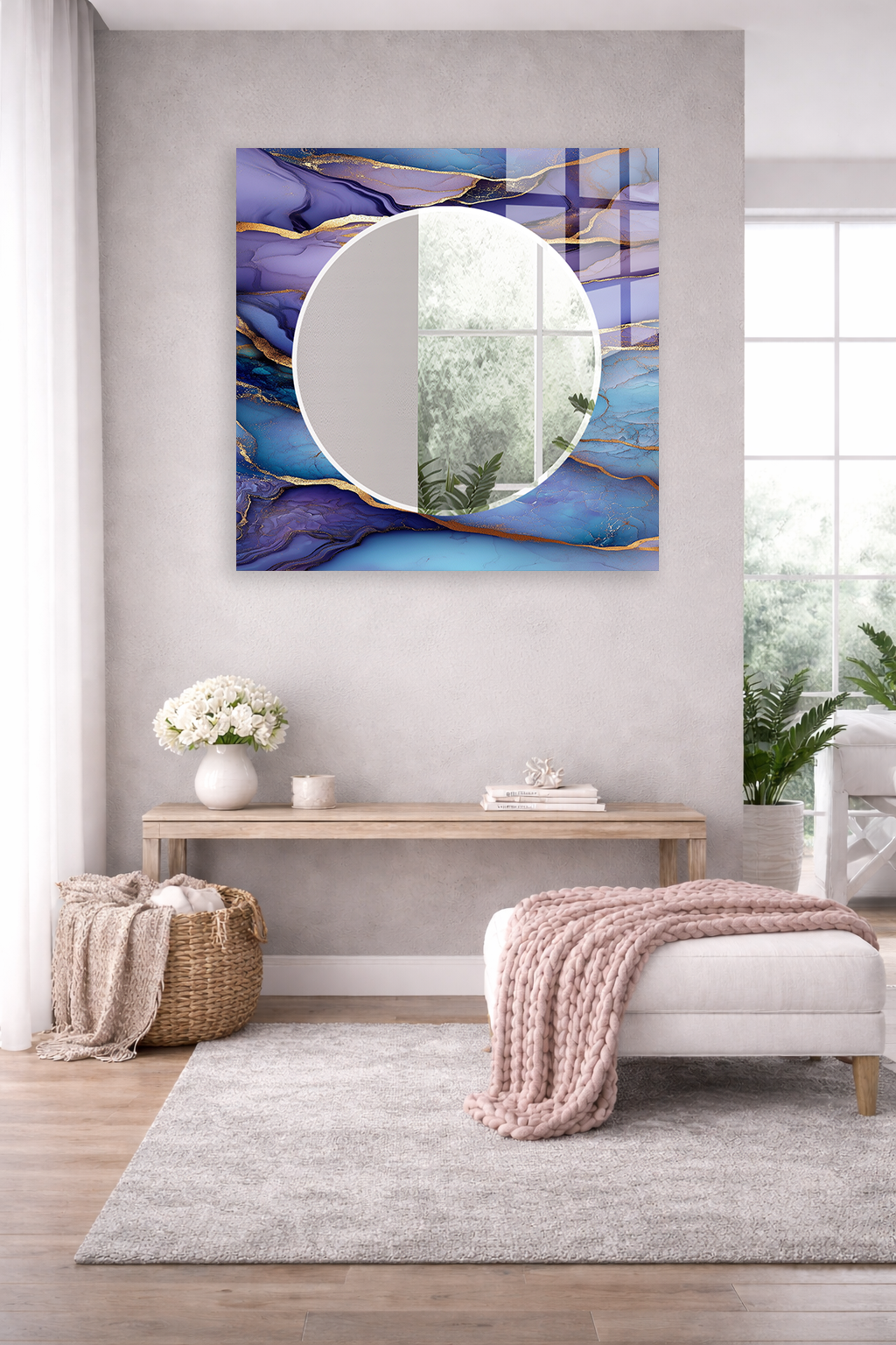 HEM TABLO HEM AYNA MAVİ MERMER DOKULU MODERN TASARIM CAM DUVAR AYNASI EV DEKORU