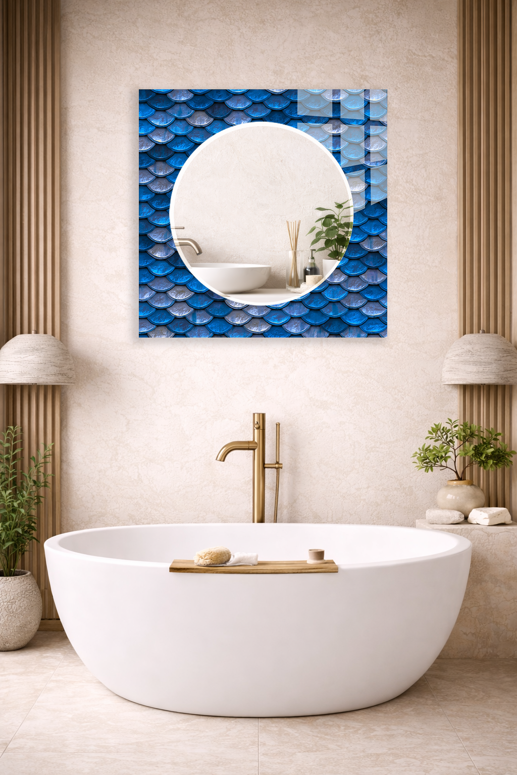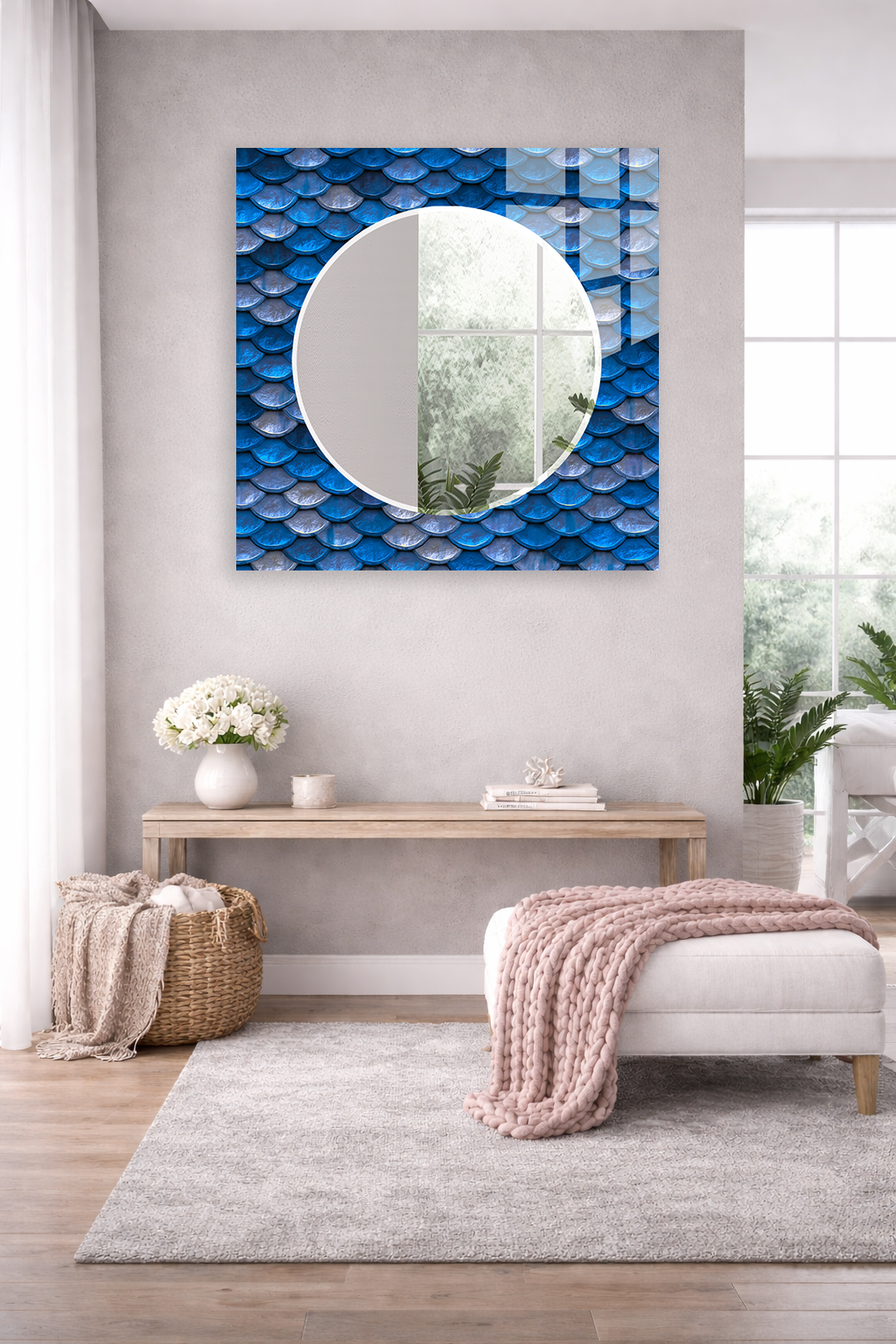 HEM TABLO HEM AYNA MAVİ PUL DOKULU 3D DESEN CAM DUVAR AYNASI EV DEKORU