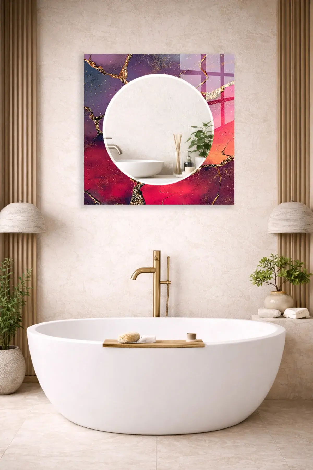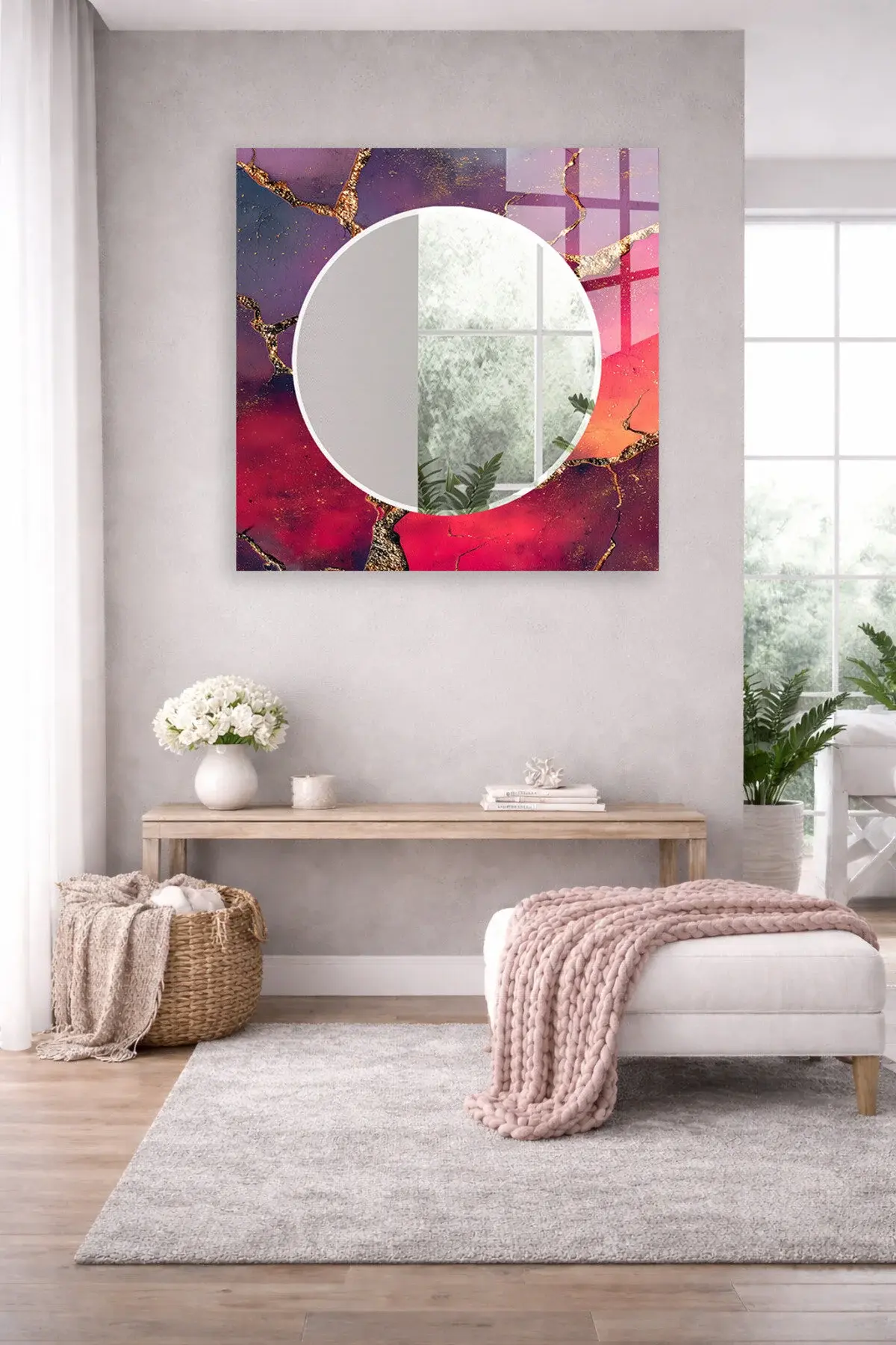HEM TABLO HEM AYNA MOR KIRMIZI ALTIN ÇATLAK CAM DUVAR AYNASI EV DEKORU