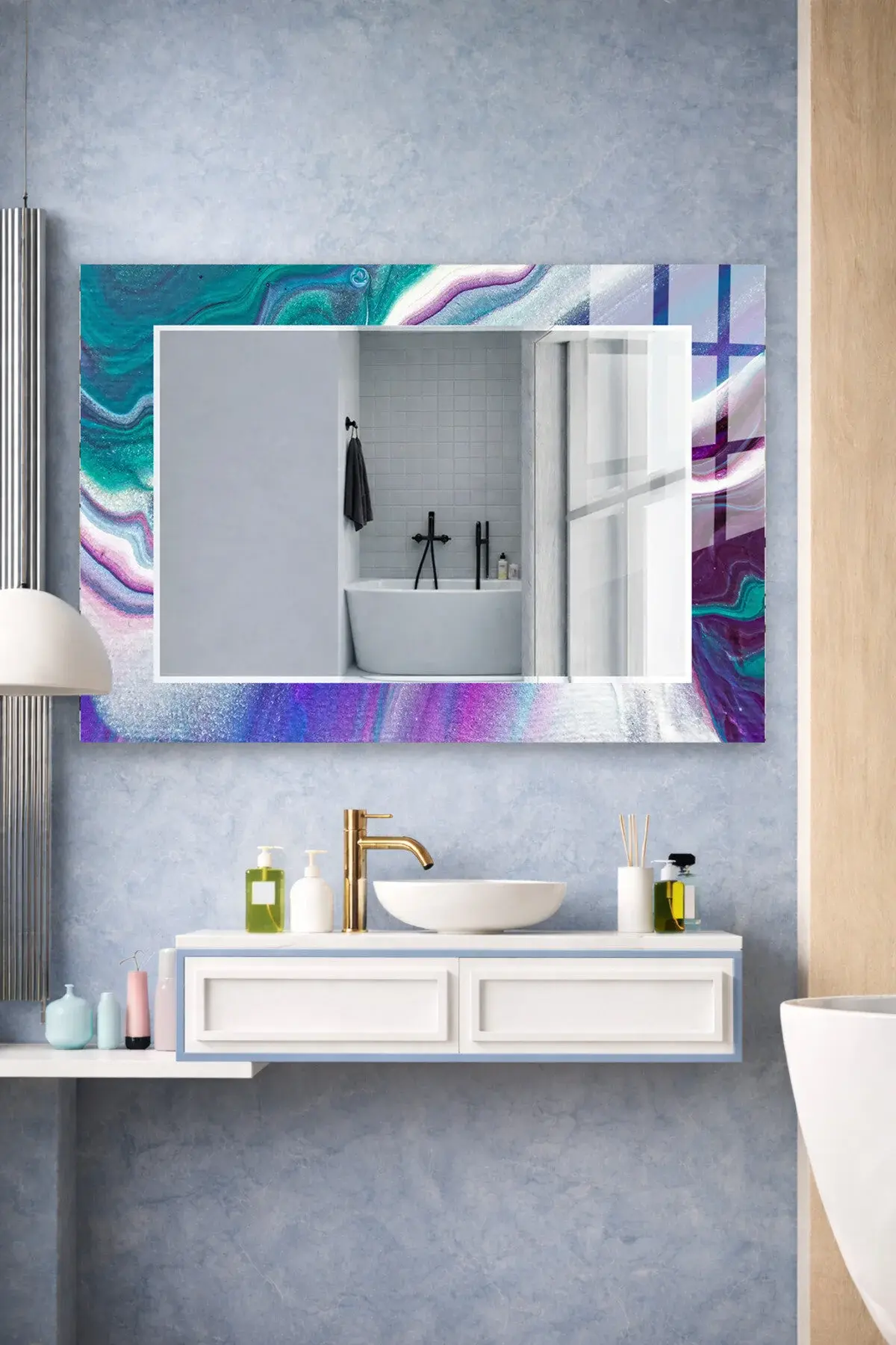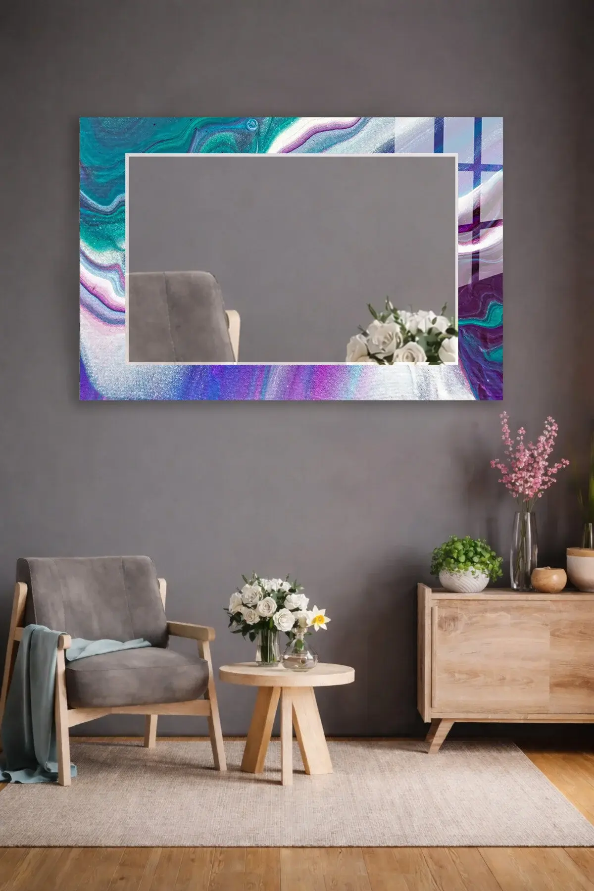 HEM TABLO HEM AYNA MOR TURKUAZ SOYUT AKIŞKAN TASARIM CAM DUVAR AYNASI EV DEKORU