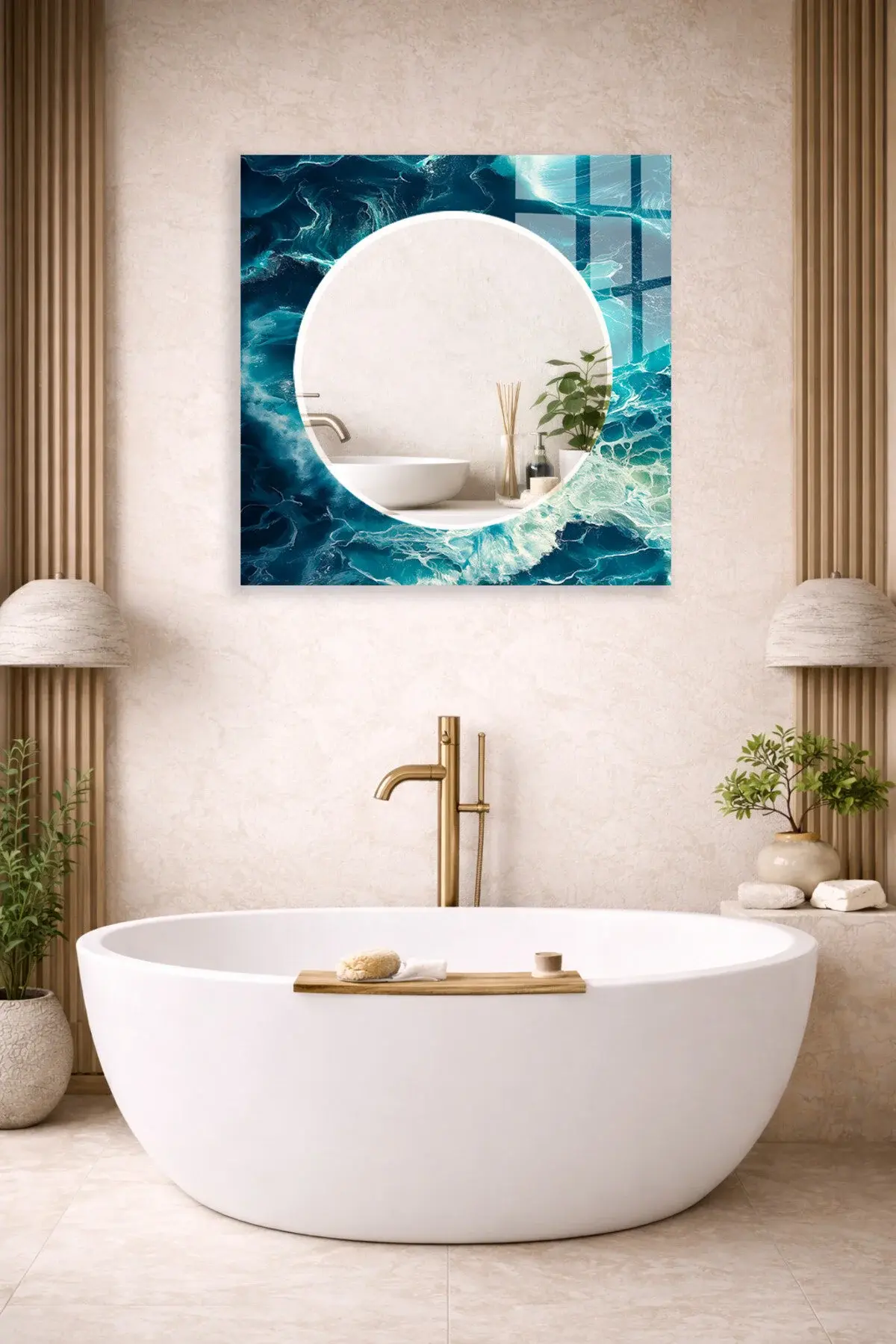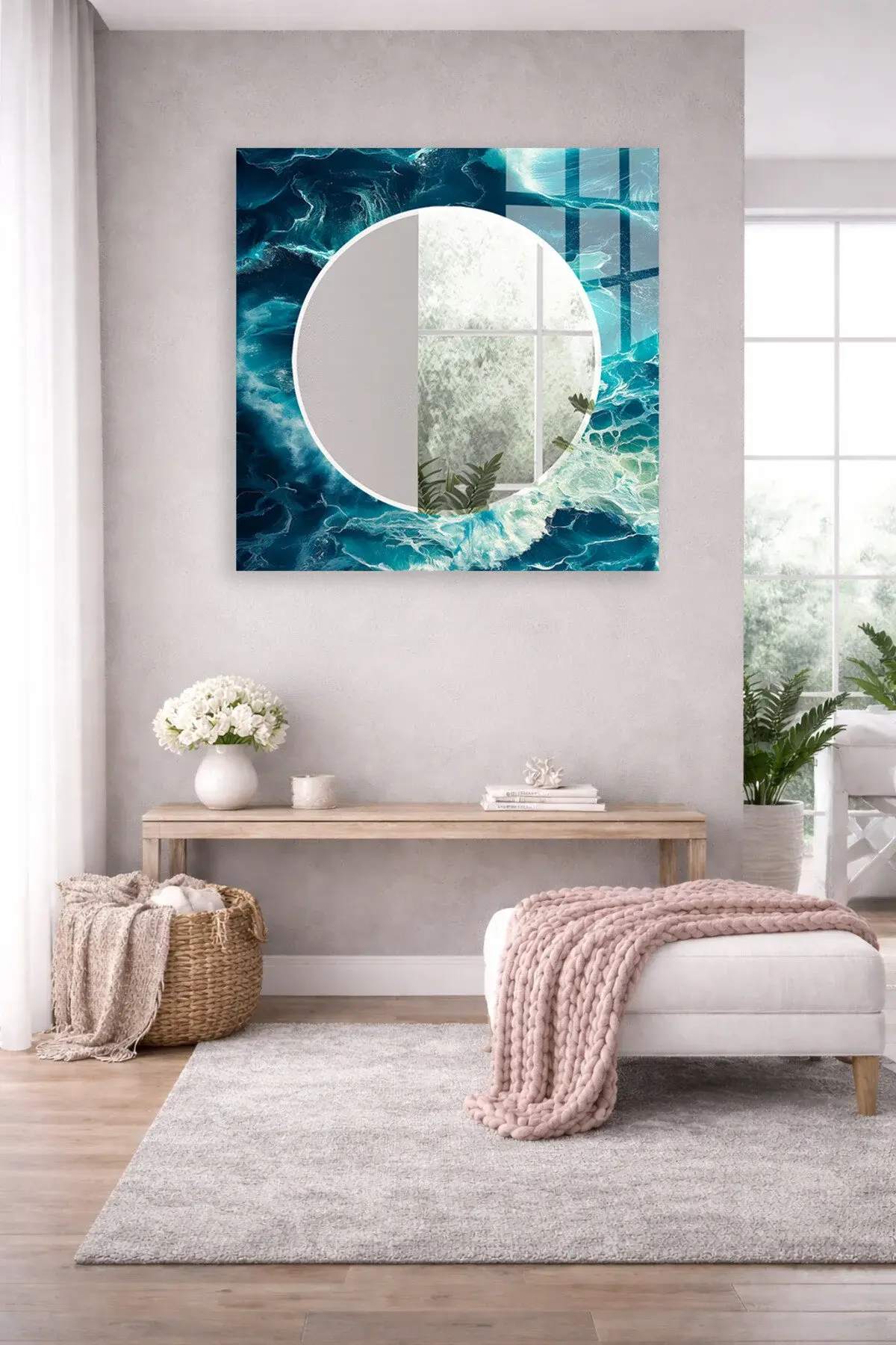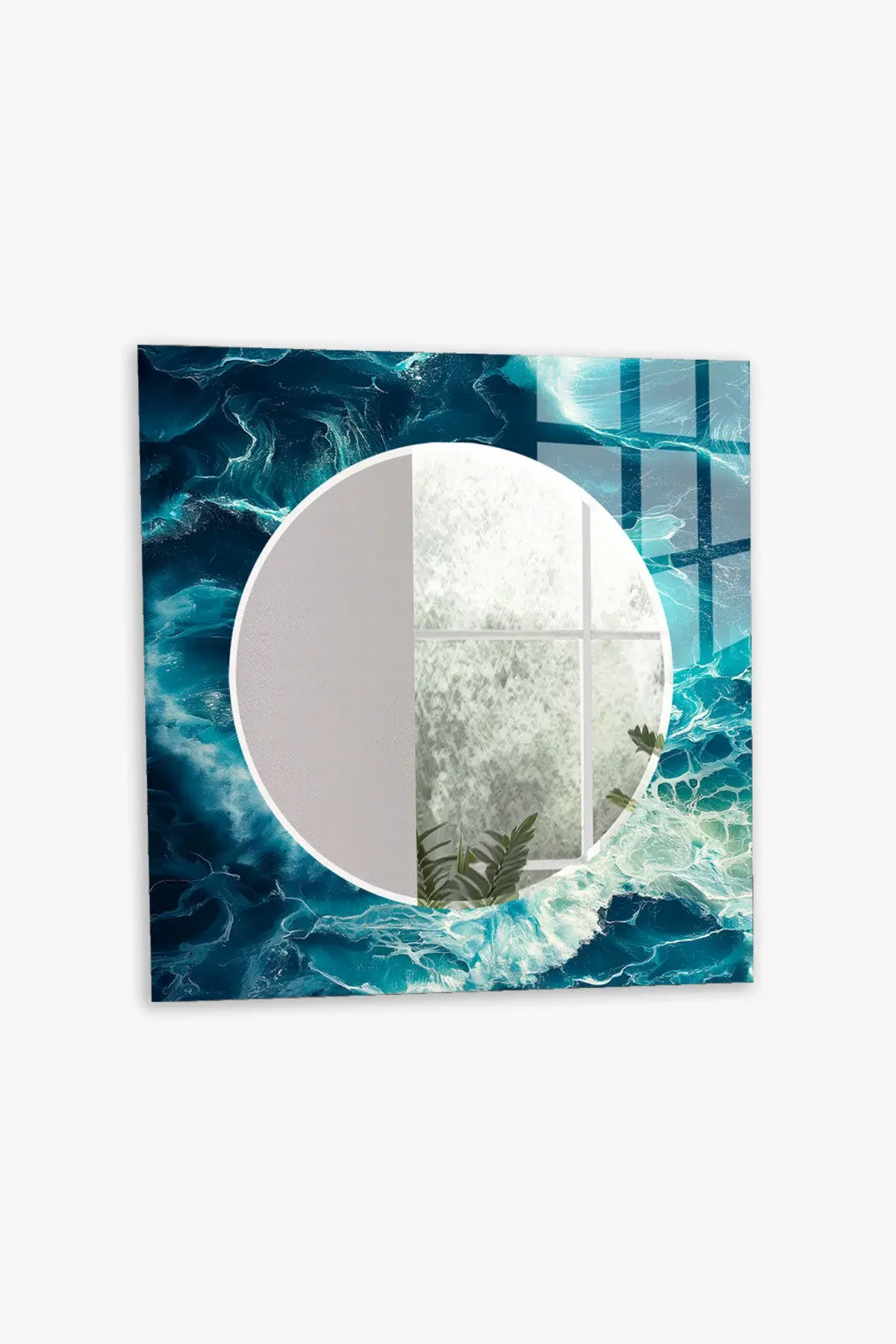 HEM TABLO HEM AYNA OKYANUS MAVİ DALGA DESEN CAM DUVAR AYNASI EV DEKORU