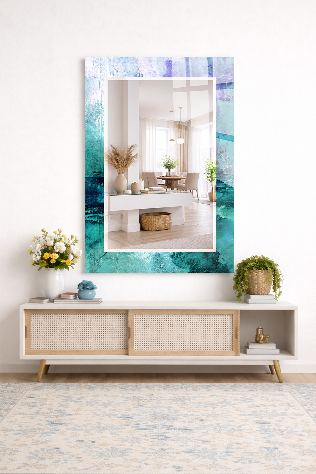 Dekoratif duvar aynası, tablo estetiği ile aynanın işlevselliğini bir araya getirerek yaşam alanlarına şıklık kazandırır.