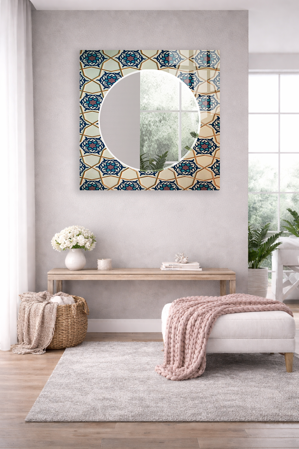 Dekoratif duvar aynası, tablo estetiği ile aynanın işlevselliğini bir araya getirerek yaşam alanlarına şıklık kazandırır.