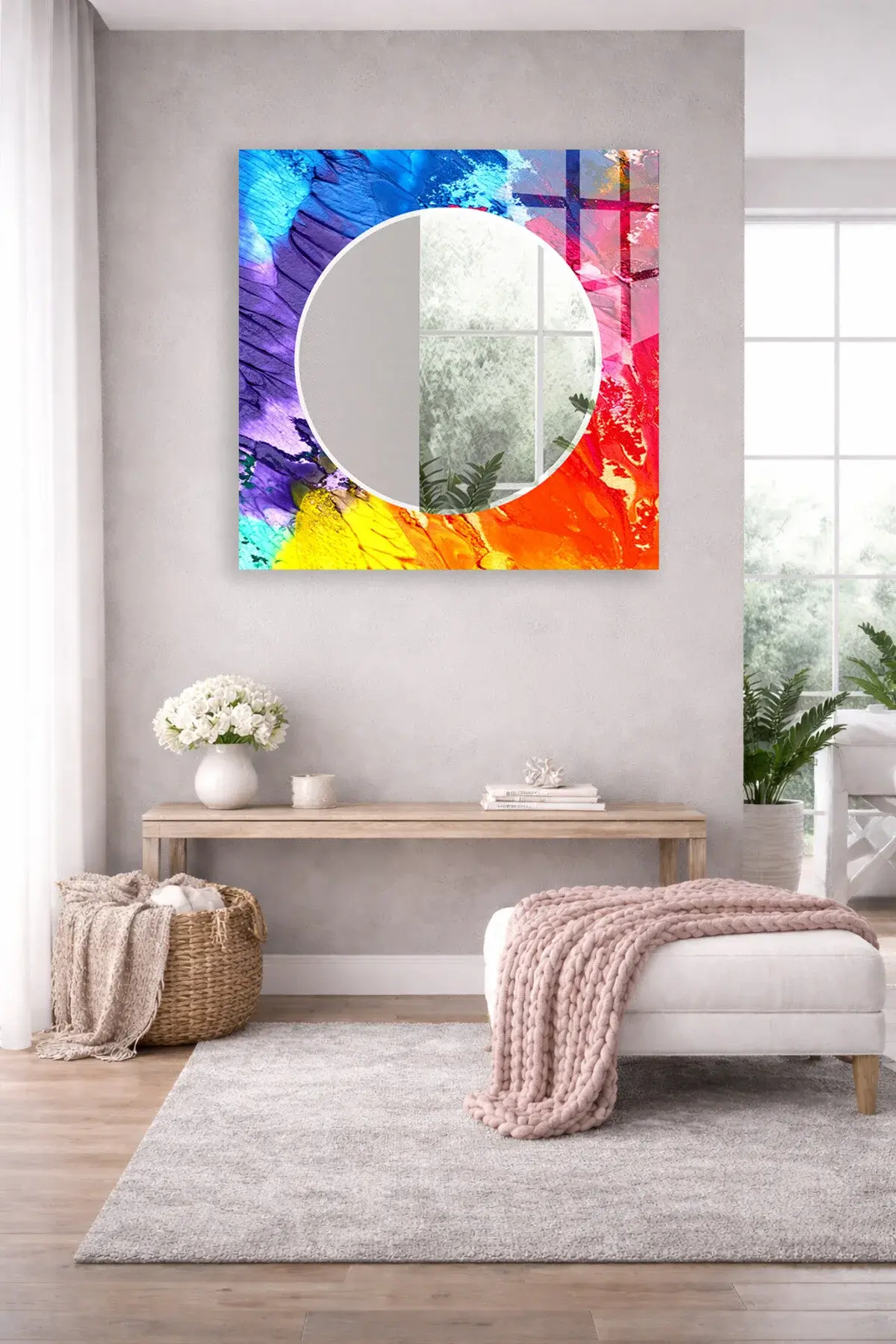 HEM TABLO HEM AYNA RENKLİ FIRÇA DARBELİ SOYUT CAM DUVAR AYNASI EV DEKORU