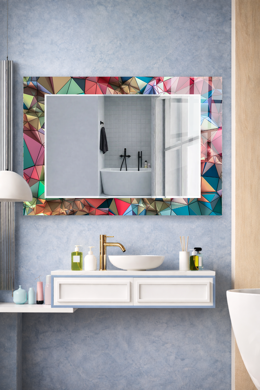 HEM TABLO HEM AYNA RENKLİ GEOMETRİK POLİGON SANAT CAM DUVAR AYNASI EV DEKORU