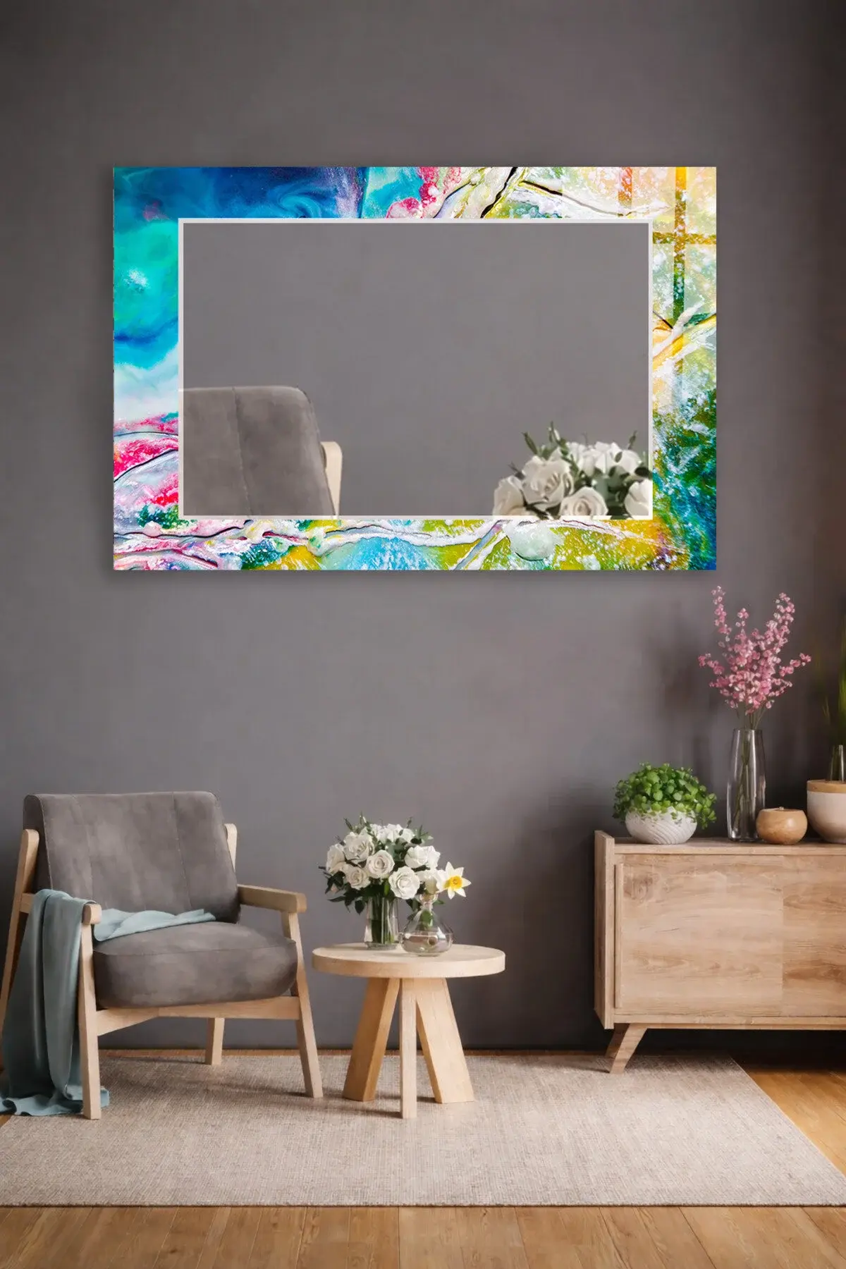 Hem tablo hem ayna formundaki bu dekoratif duvar aynası, bulunduğu mekâna derinlik, ışık ve zarafet kazandıran tamamlayıcı bir tasarım ürünüdür.