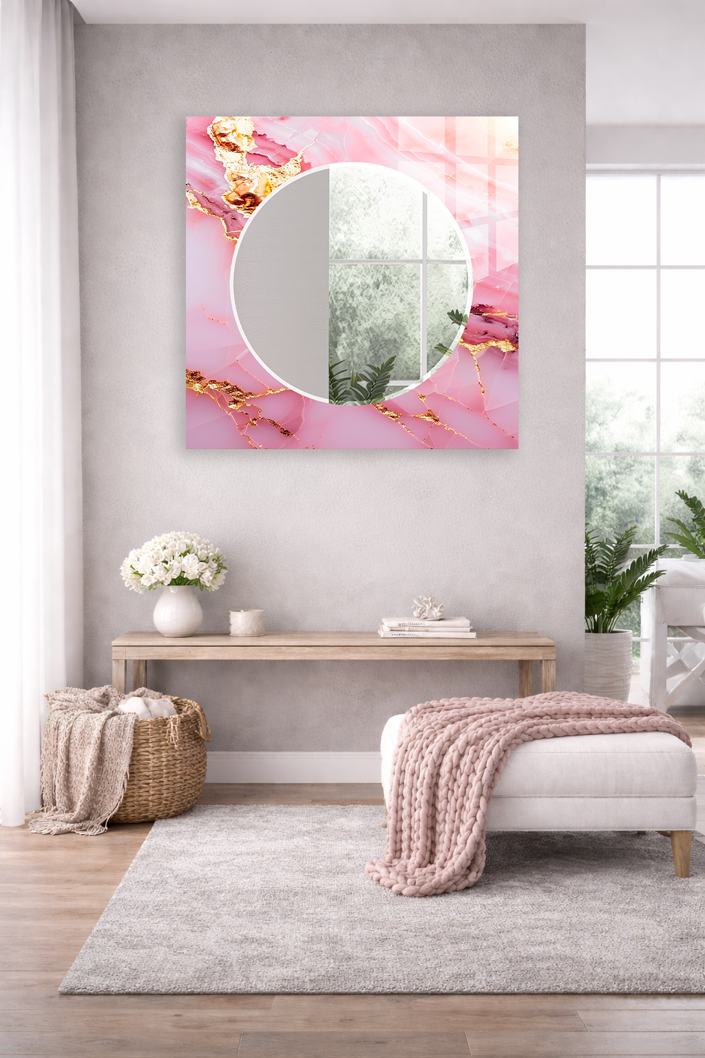 Hem dekoratif bir duvar objesi hem de kullanışlı bir ayna olarak tasarlanan bu özel ürün, ev ve ofis dekorasyonuna modern ve ferah bir atmosfer katar.