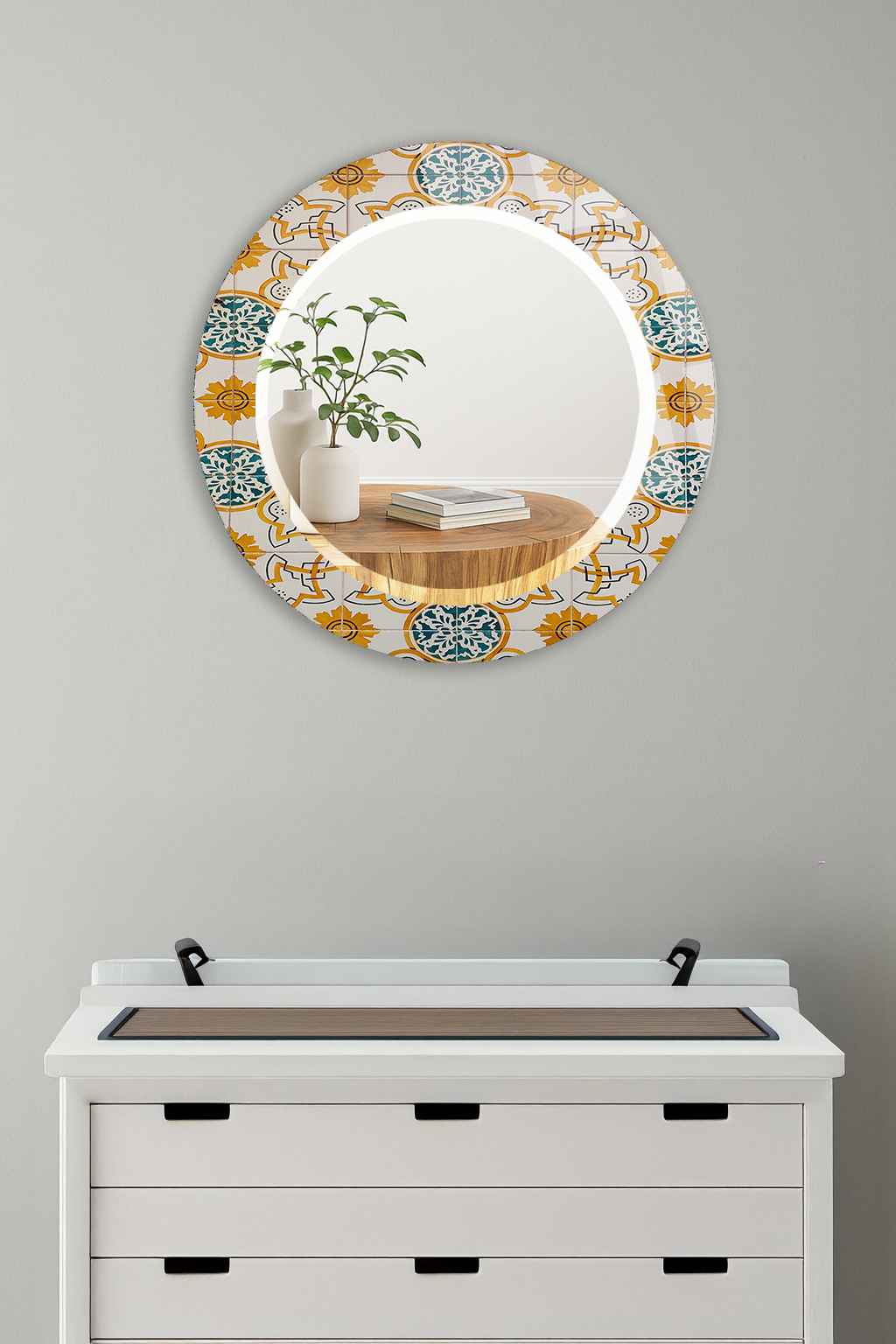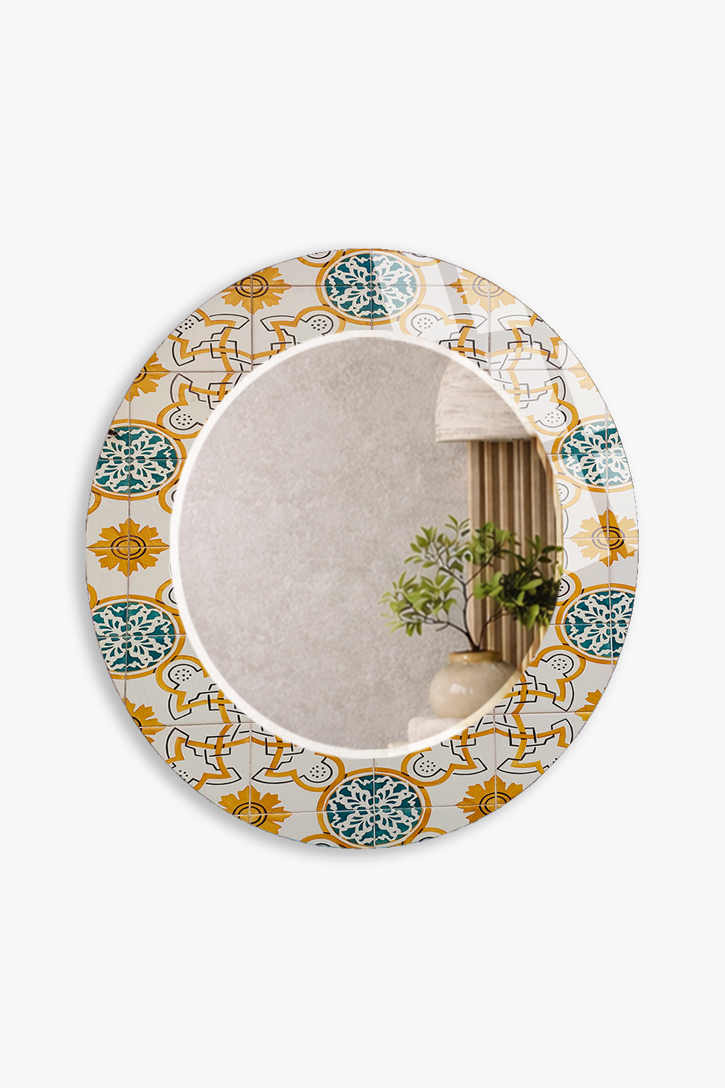 HEM TABLO HEM AYNA SARI MAVİ OSMANLI ÇİNİ DESEN CAM DUVAR AYNASI EV DEKORU
