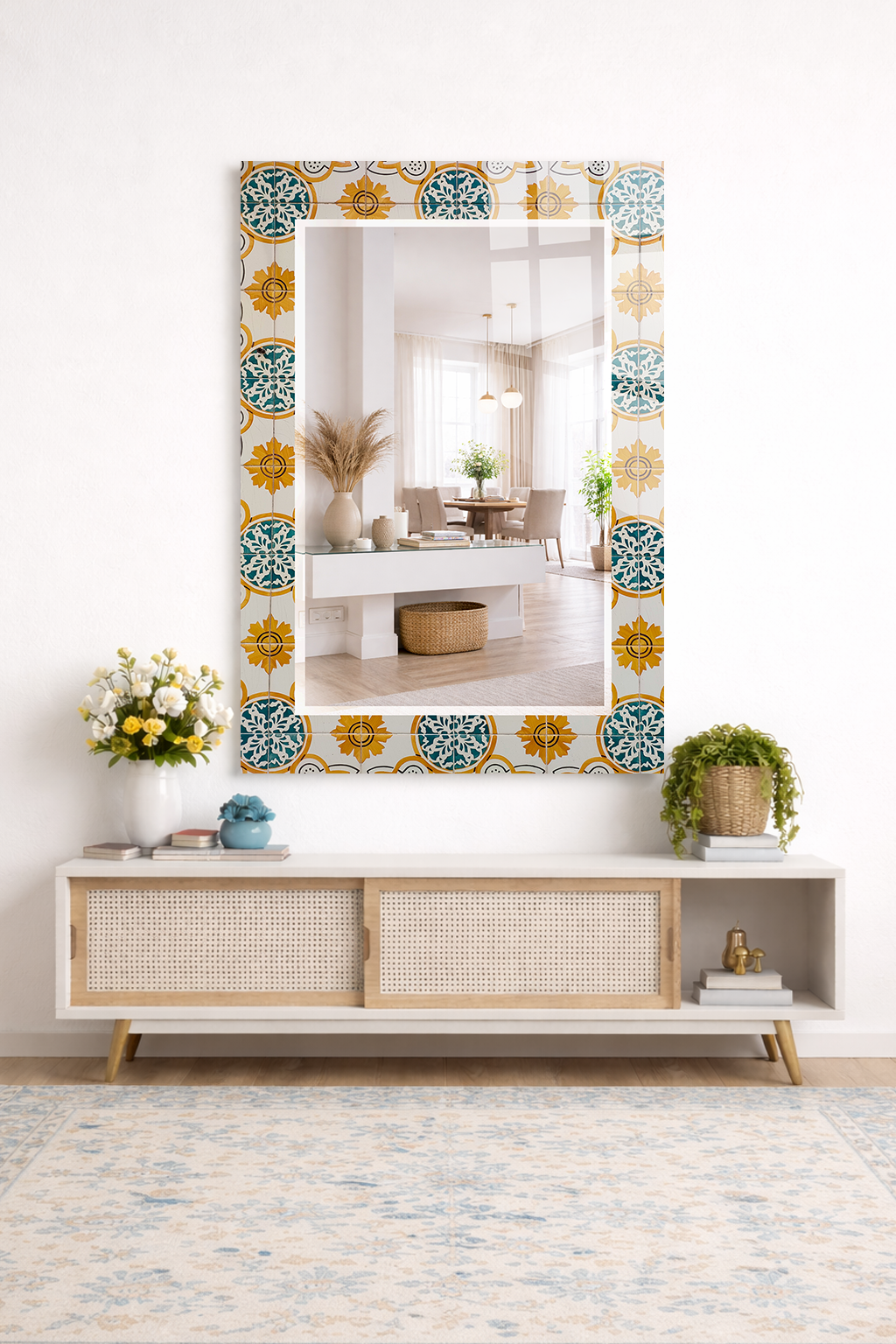 HEM TABLO HEM AYNA SARI TURKUAZ RETRO DESEN CAM DUVAR AYNASI EV DEKORU