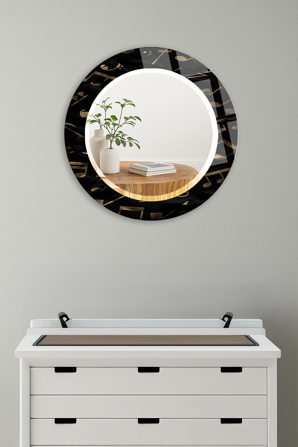HEM TABLO HEM AYNA SİYAH ALTIN MÜZİK NOTALI CAM DUVAR AYNASI EV DEKORU