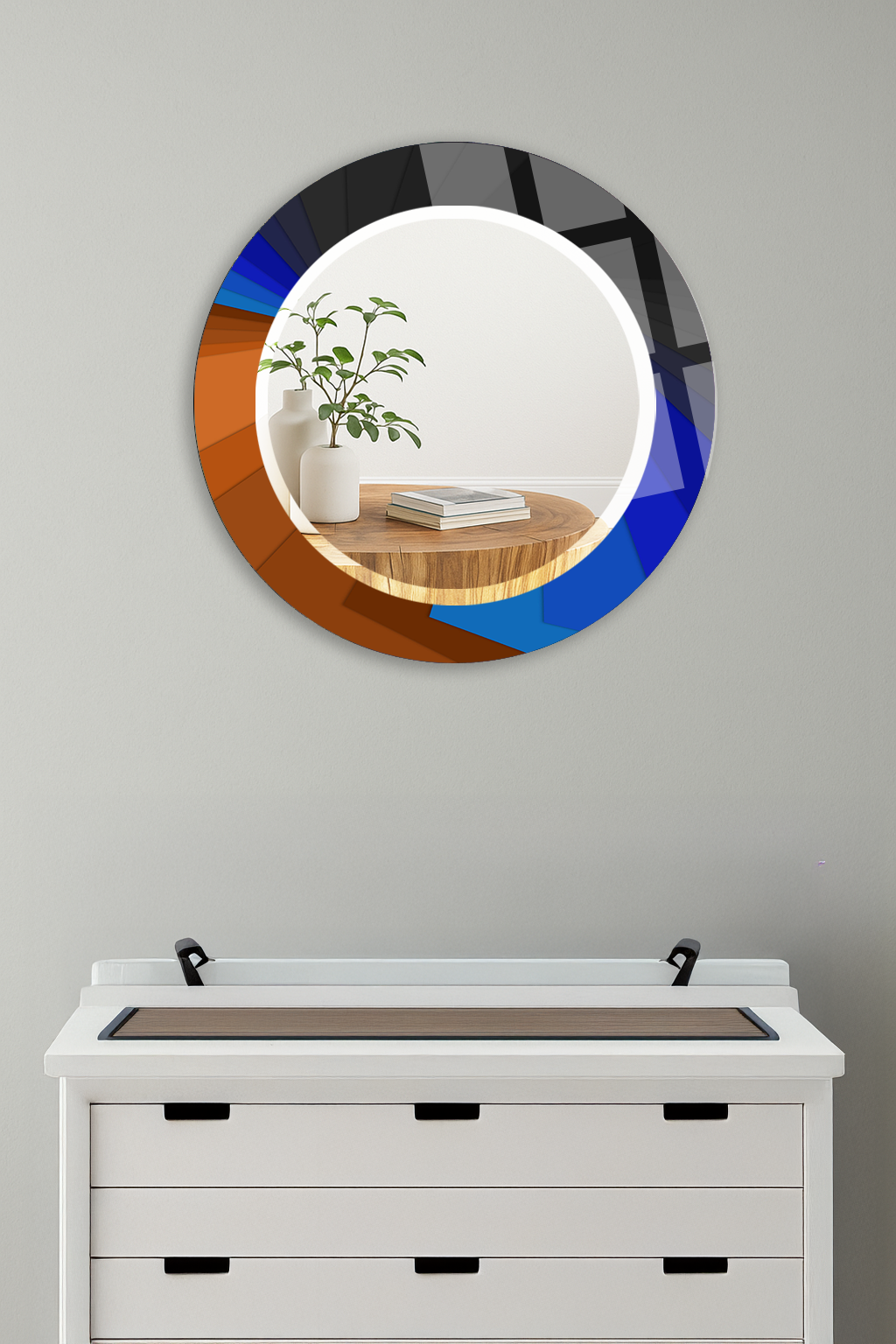 HEM TABLO HEM AYNA SİYAH MAVİ RENKLİ TASARIM CAM DUVAR AYNASI EV DEKORU