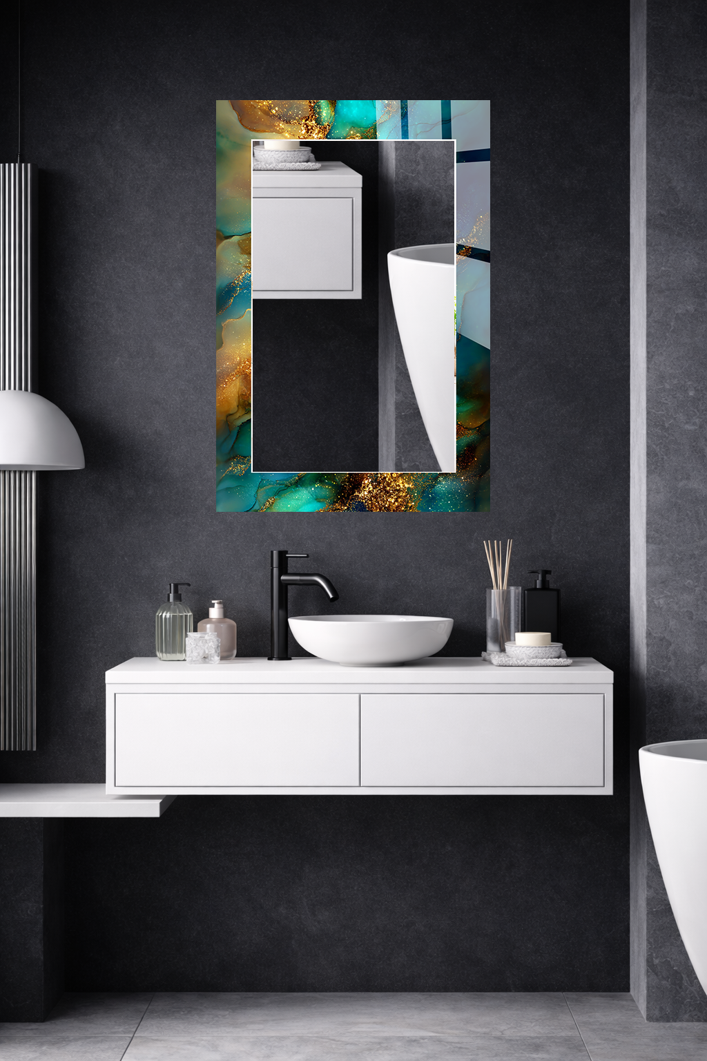 HEM TABLO HEM AYNA TURKUAZ ALTIN AKIŞKAN MERMER CAM DUVAR AYNASI EV DEKORU