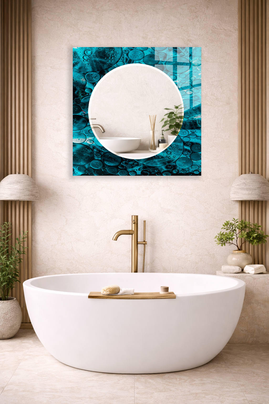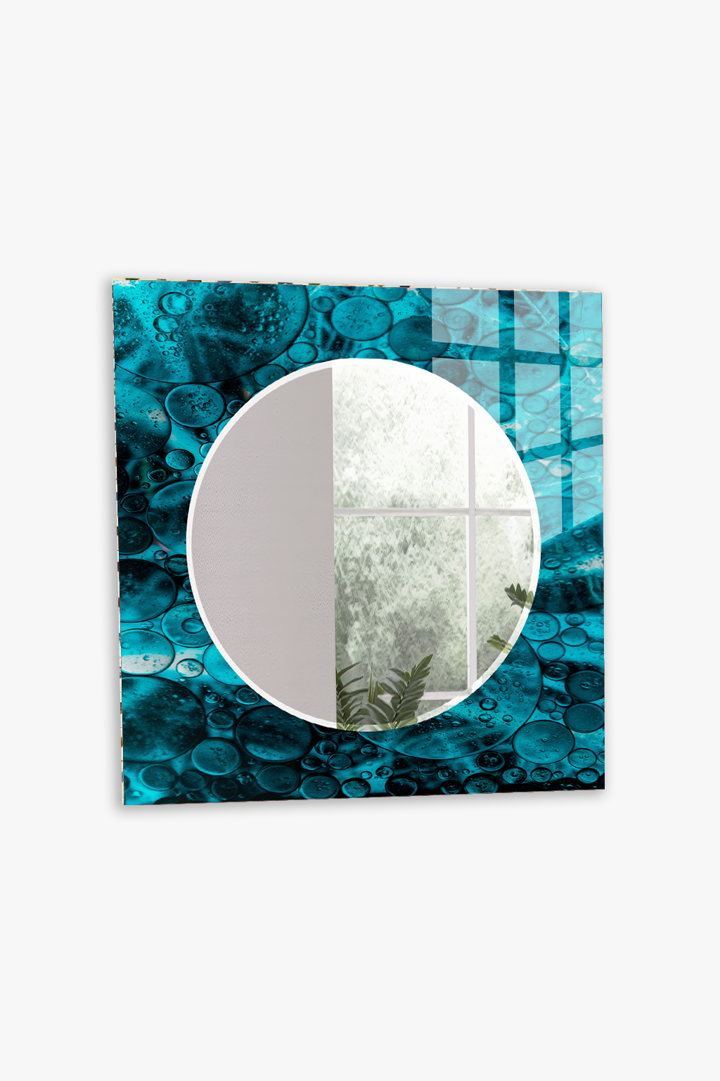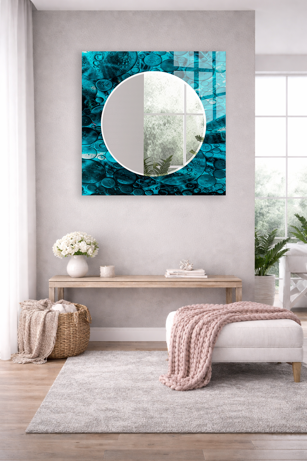 HEM TABLO HEM AYNA TURKUAZ BALONCUK EFEKTLİ CAM DUVAR AYNASI EV DEKORU