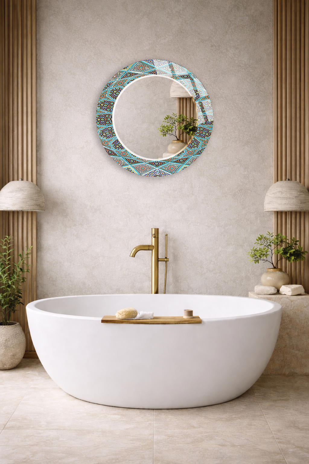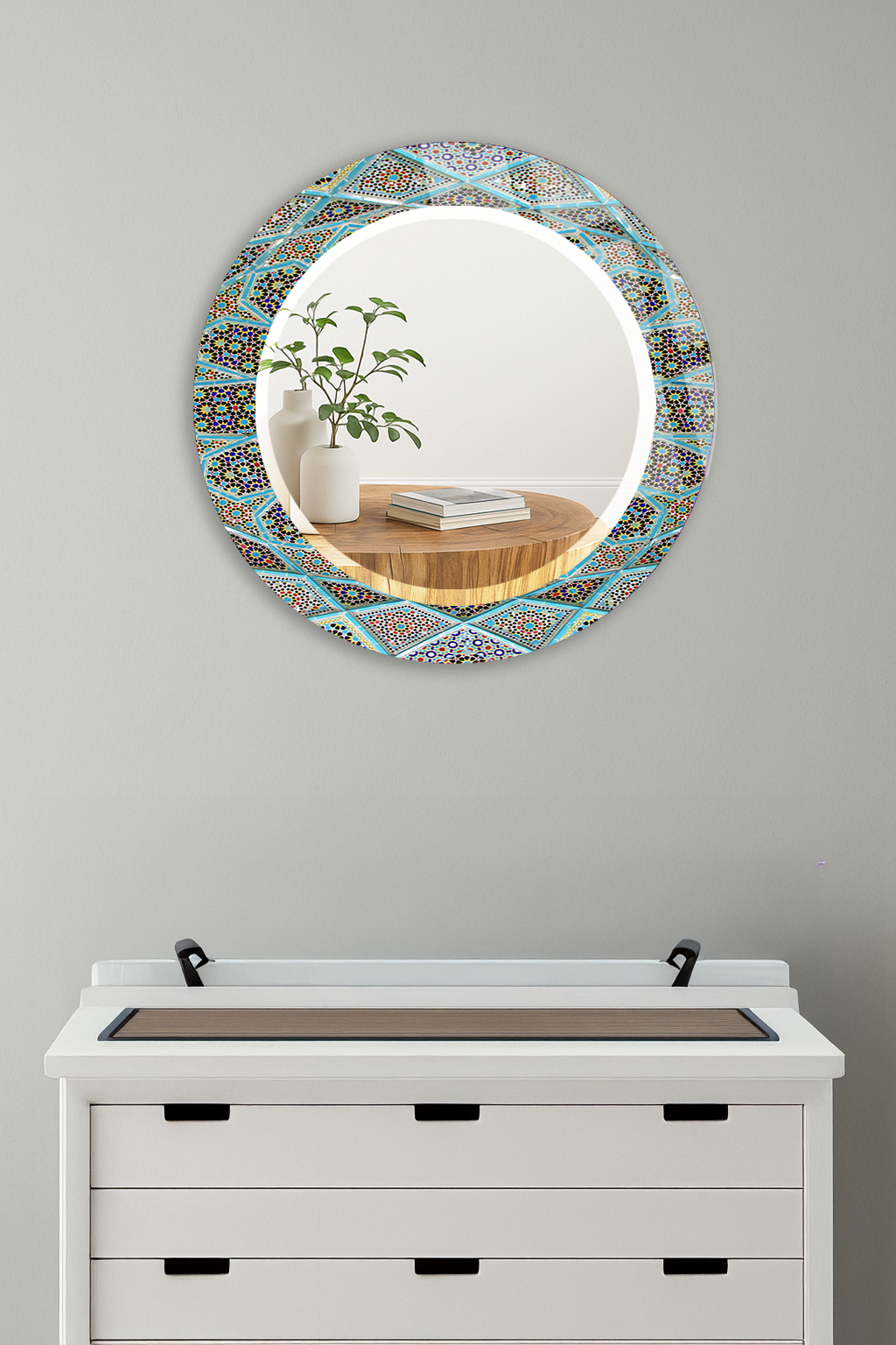 HEM TABLO HEM AYNA TURKUAZ İSLAMİ GEOMETRİK MOZAIK DESEN CAM DUVAR AYNASI EV DEKORU