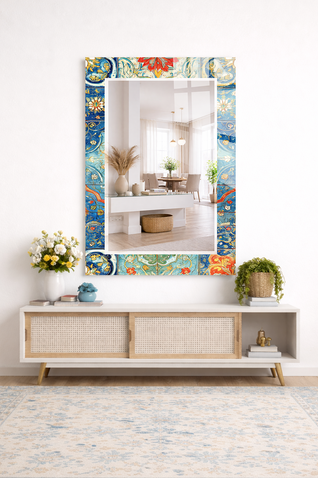 Dekoratif duvar aynası, tablo estetiği ile aynanın işlevselliğini bir araya getirerek yaşam alanlarına şıklık kazandırır.