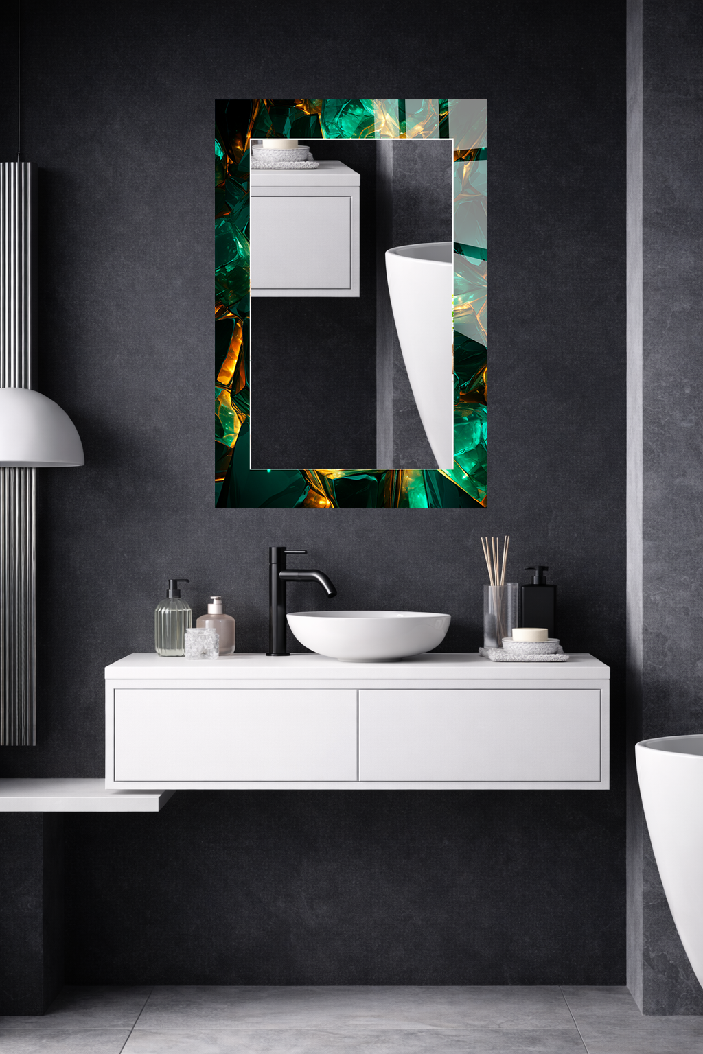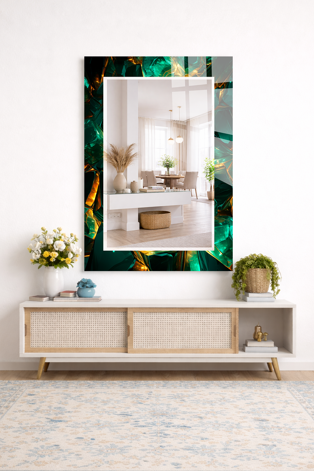 HEM TABLO HEM AYNA ZÜMRÜT YEŞİL KRİSTAL DOKU DESEN CAM DUVAR AYNASI EV DEKORU