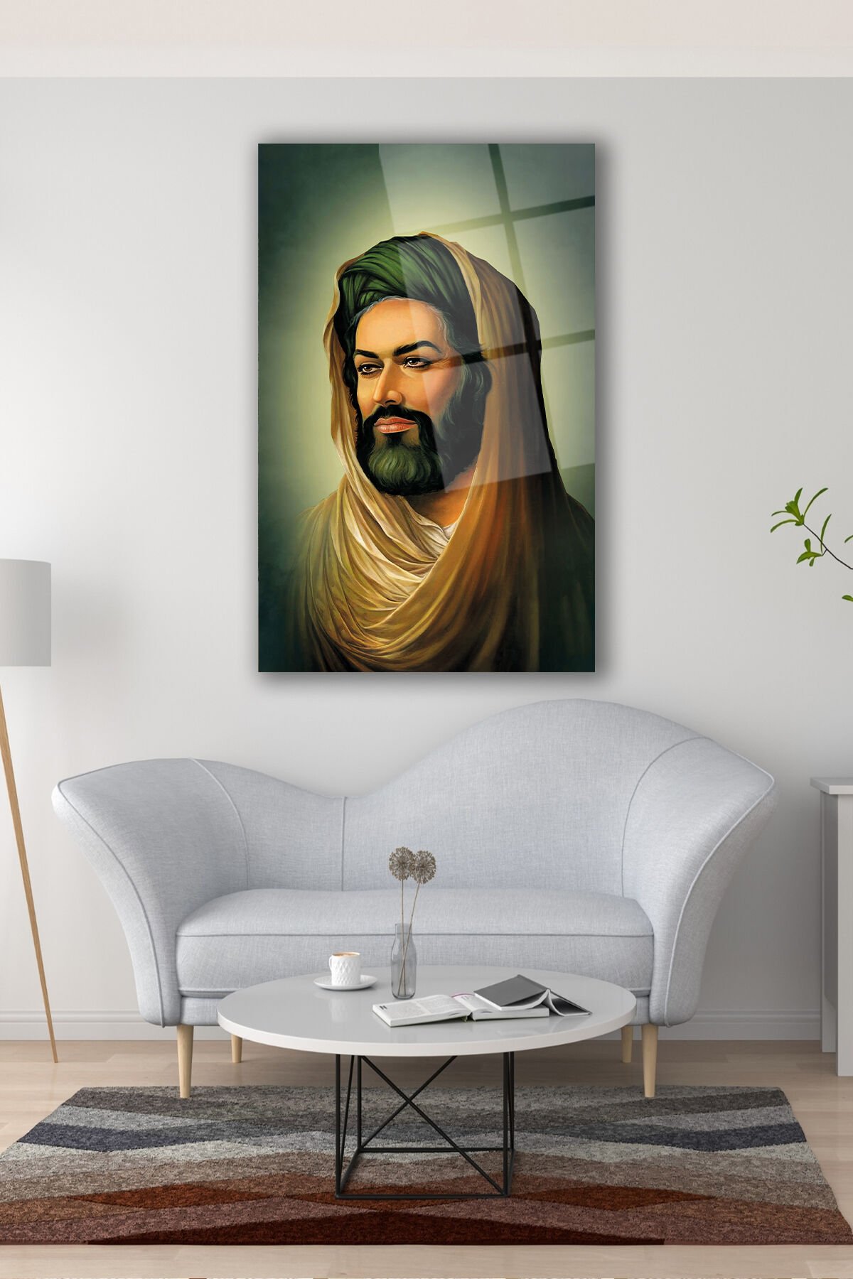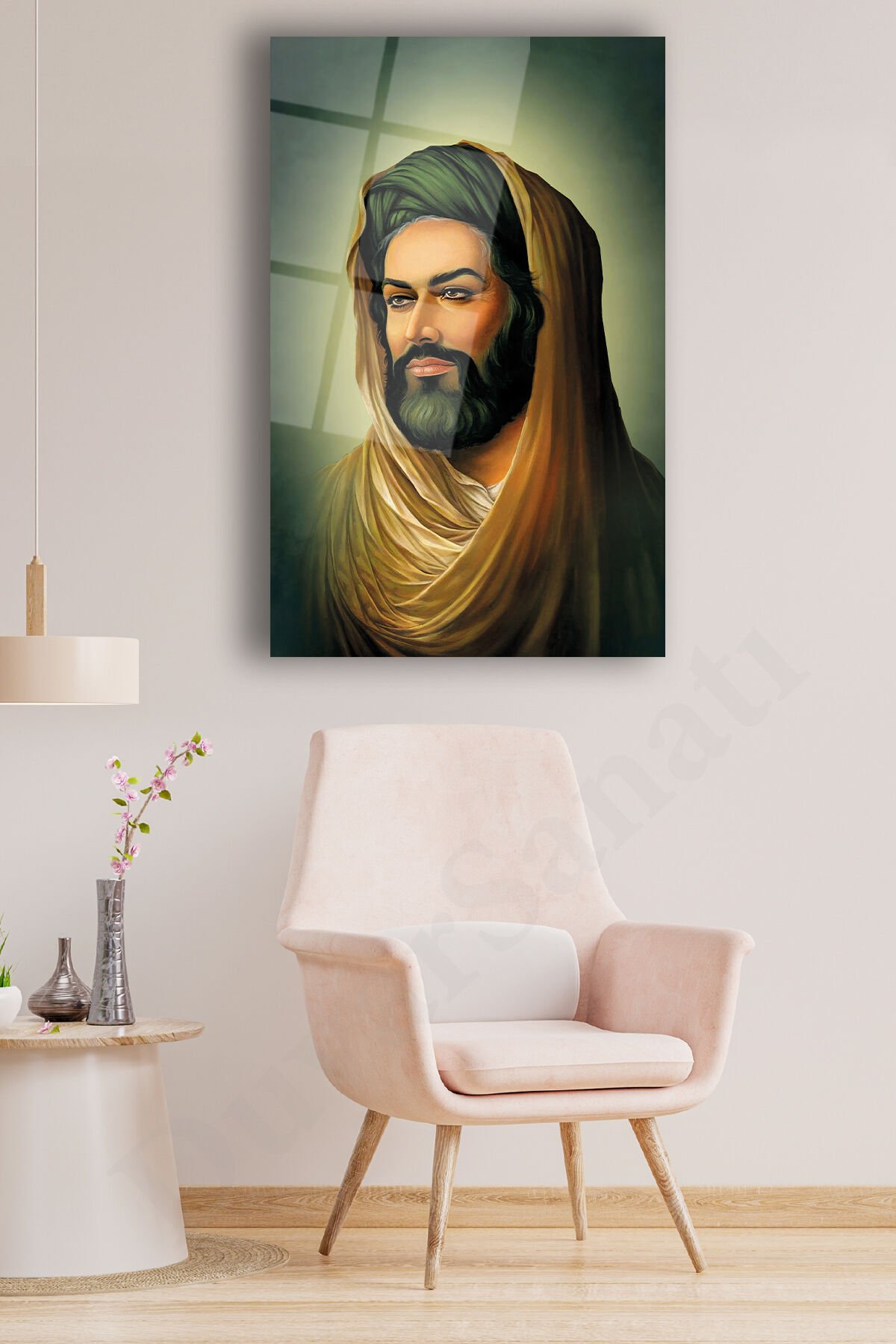 Hz. Ali Cam Tablo Dini İslami Ev Ofis Salon Dekorasyonu Büyük Tablo Dekor Yeşil Kahverengi